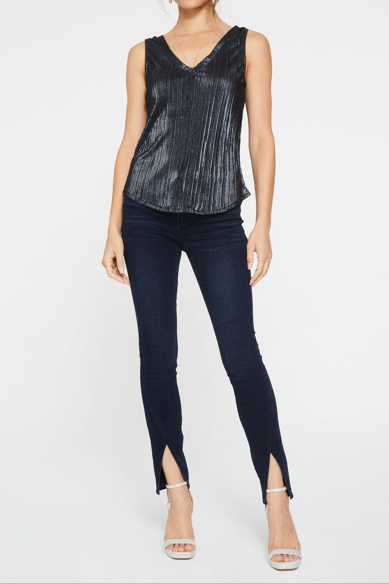 Pleated ACACIA tank, front and back double v-neck finished with copper foil coverage. "Who's that girl!" The bold & fearless trendsetter in Luxe, the go-to for hanging out or hosting star! Solid color woven on standard fit.
