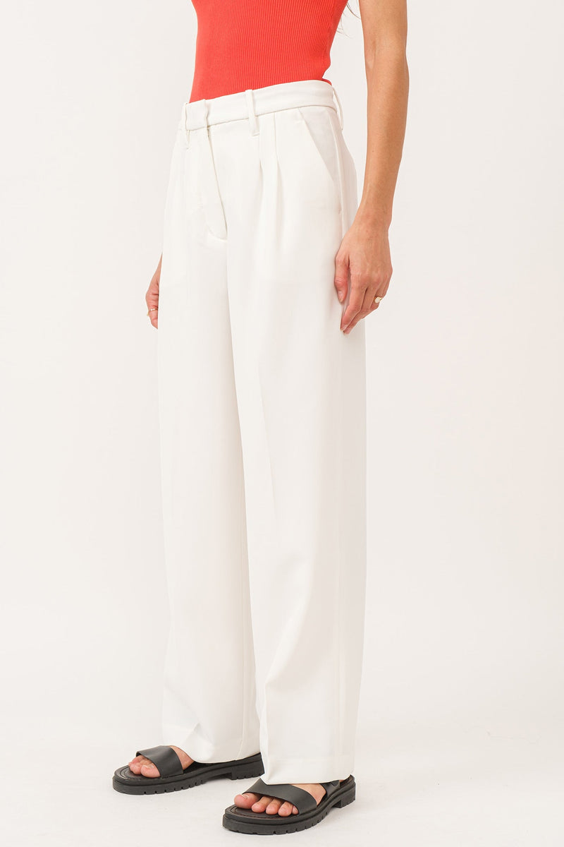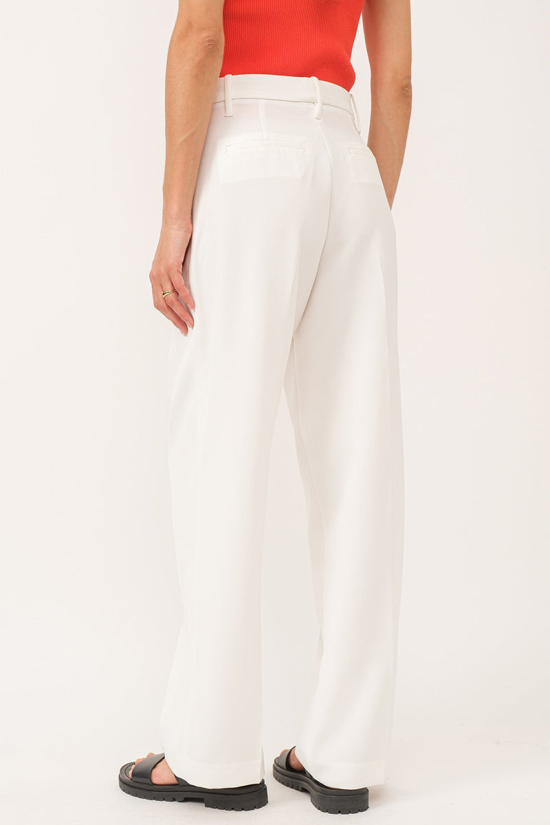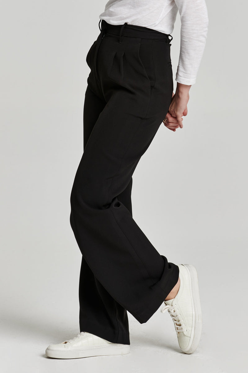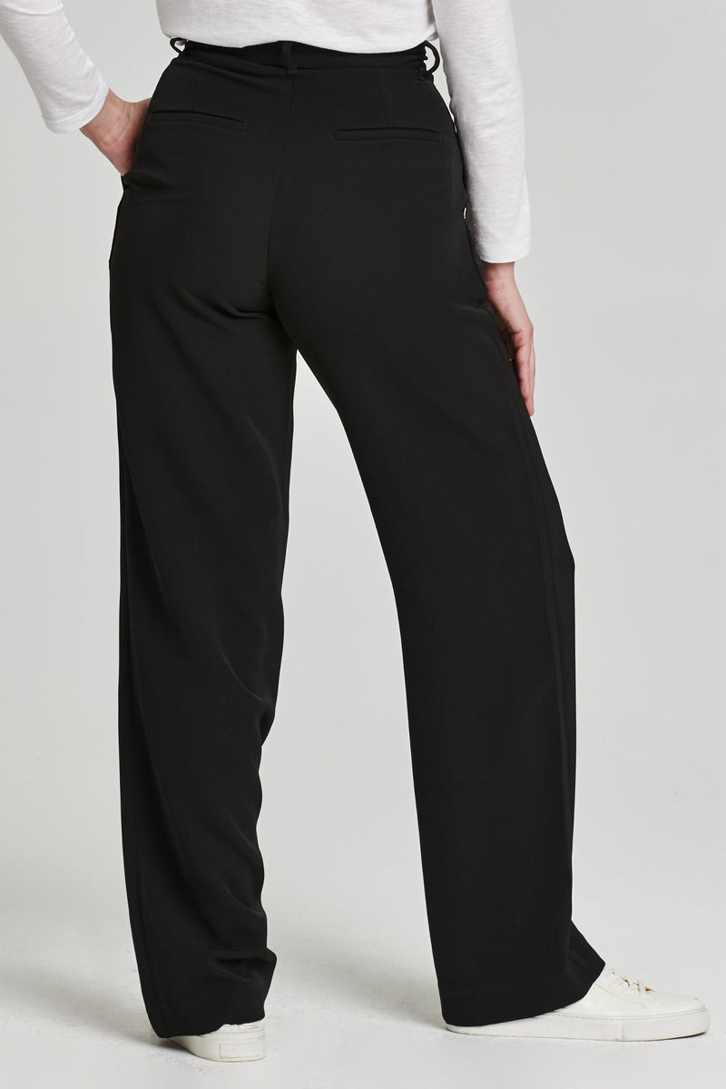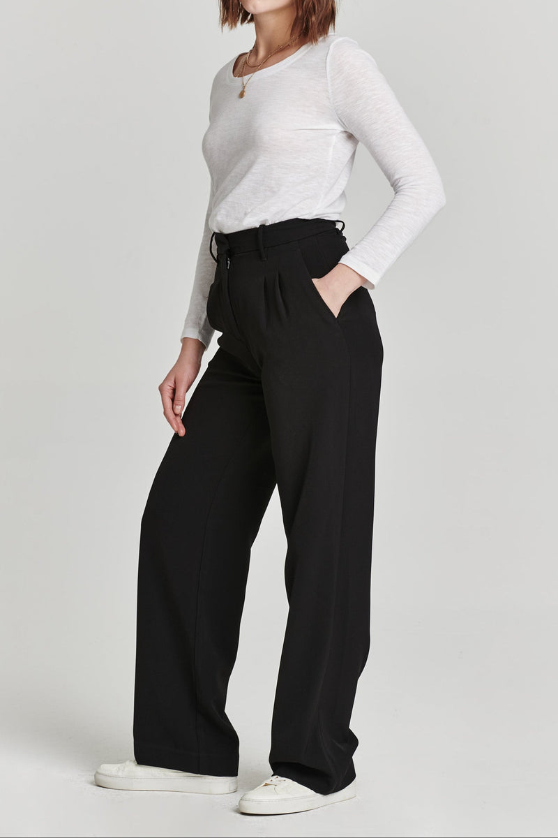 ADELAIDE high rise wide leg pant with belt loops, trouser cut with front zipper and button closure, side slant & welt back pockets, front pleat and back dart for lift support. Solid color woven on relaxed fit. The paramount option for comfort and utility, the impeccable fit for any life styling.