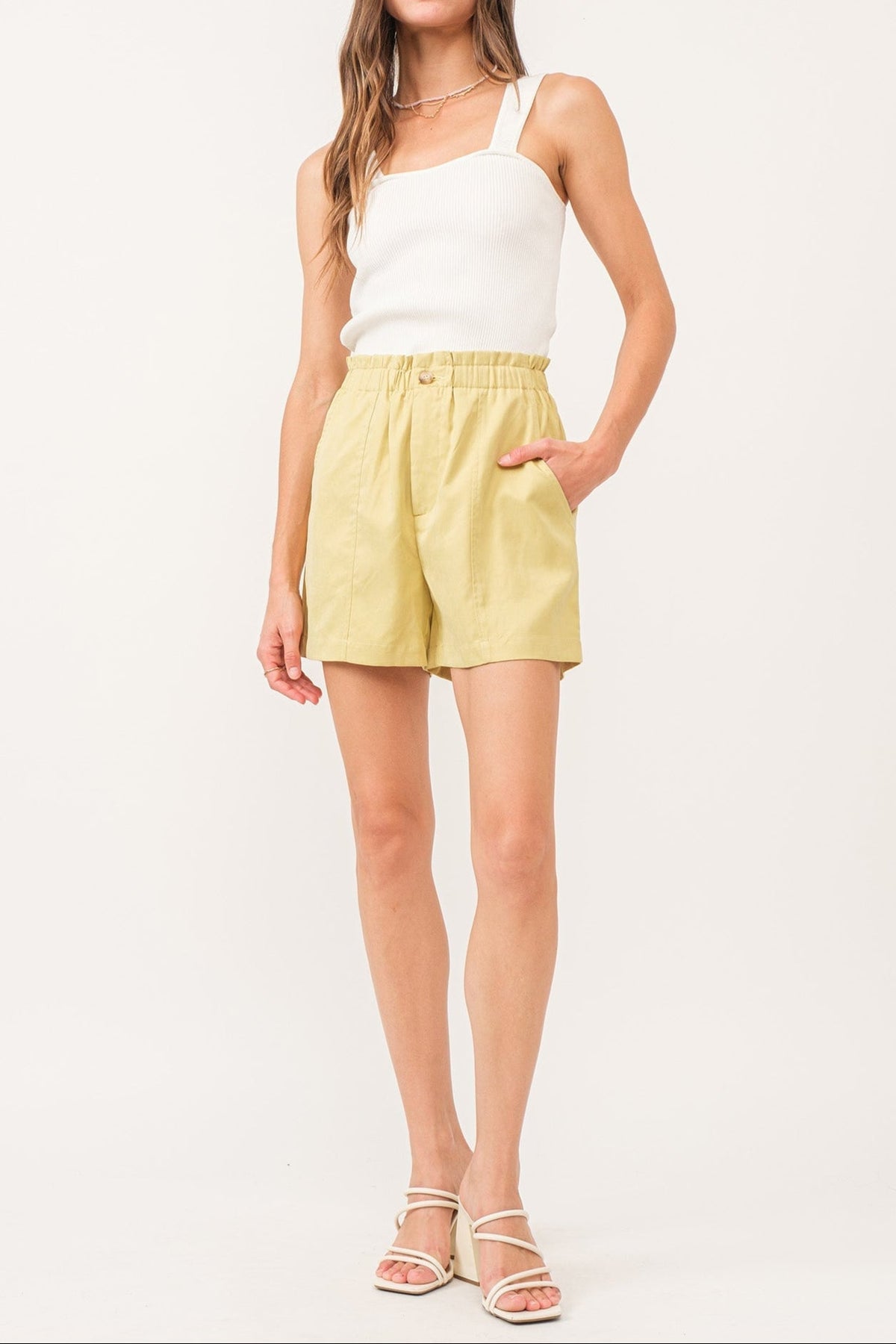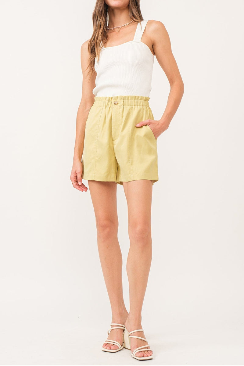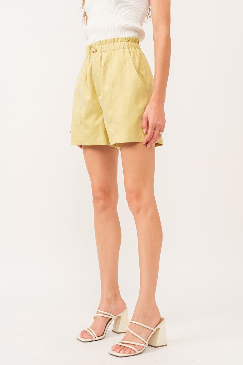Effortlessly stylish ALBANY paper-bag shorts with an elastic waist and button closure, featuring a convenient side pocket and faux fly. These shorts are the perfect blend of fun and function, ideal for any occasion that may come your way. Made of a solid color woven fabric in a relaxed fit.