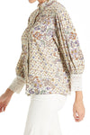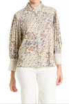 The AMIA shirt features a pleated body and puff sleeves with a button front, finished with a collar band and lace-trimmed cuffs. The relaxed fit showcases a beautiful woven print, complete with color buttons.