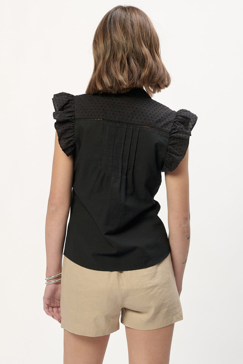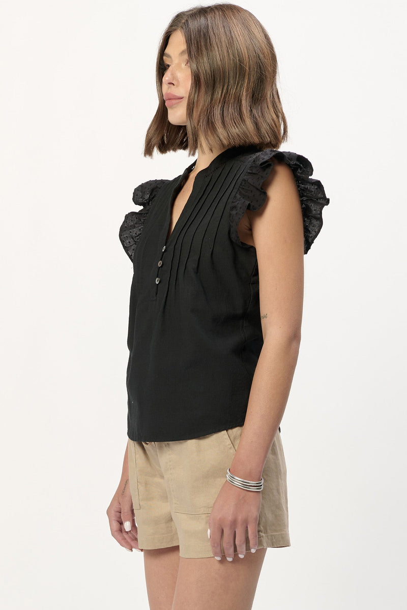 This flutter sleeve Analia top is a must-have in any wardrobe, featuring intricate lace trims that enhance its elegant silhouette, crafted from 100% cotton for a breathable and comfortable fit. Perfect for versatile outfits, this piece seamlessly transitions from casual days to chic evenings, offering both style and functionality.