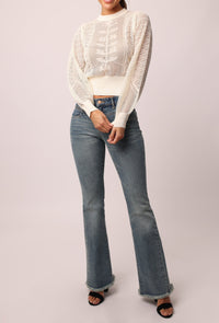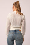 Long sleeve crop pointelle sweater with a mock neck finish. Pair with a bralette for a cute dressy look. Solid color yarn on standard fit.