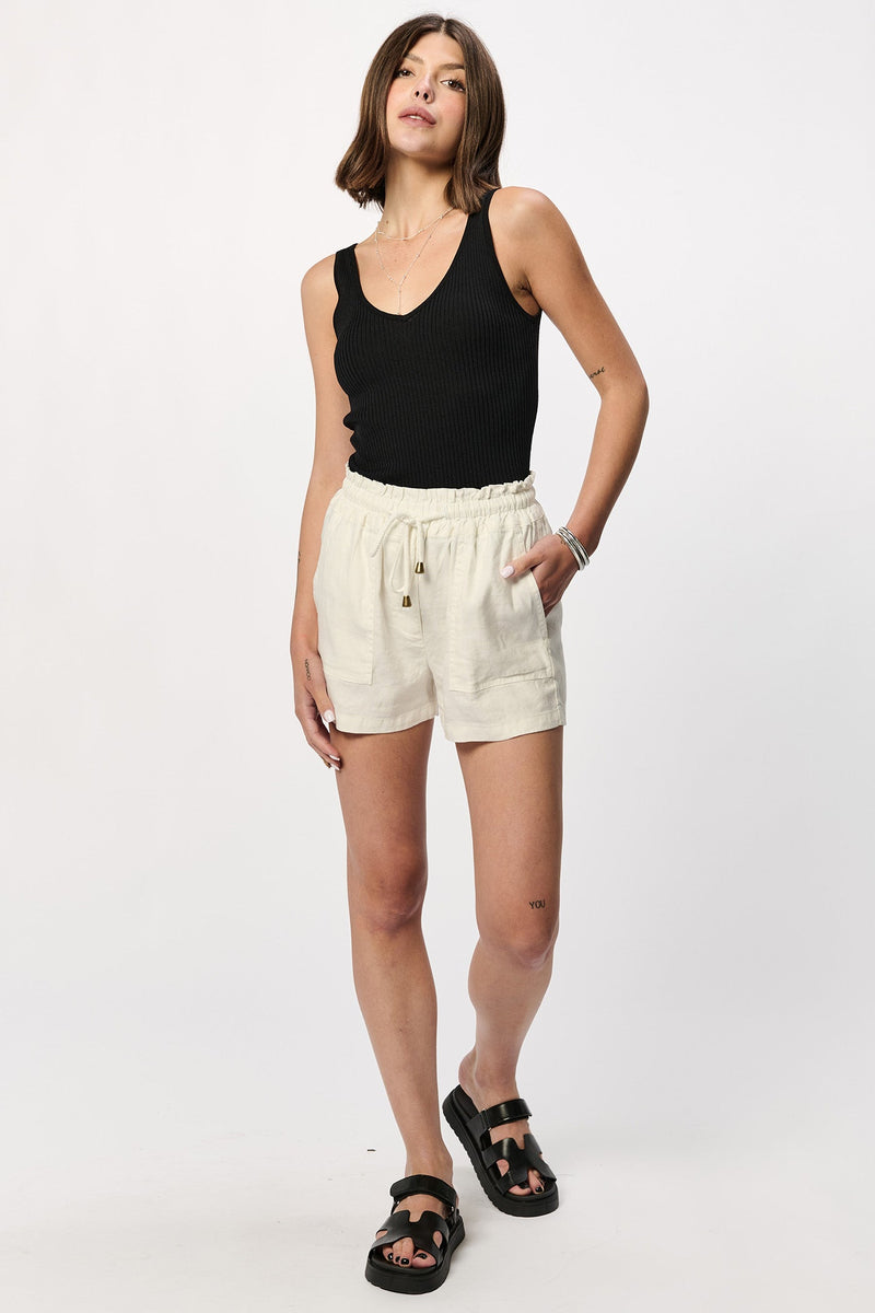 Embrace Audra shorts in linen blend with paperbag waistband and drawcord details, crafted from a premium blend of 55% linen, 42% rayon, and 3% spandex for ultimate comfort and flexibility. These versatile shorts offer a relaxed yet polished look and provide breathable wear.