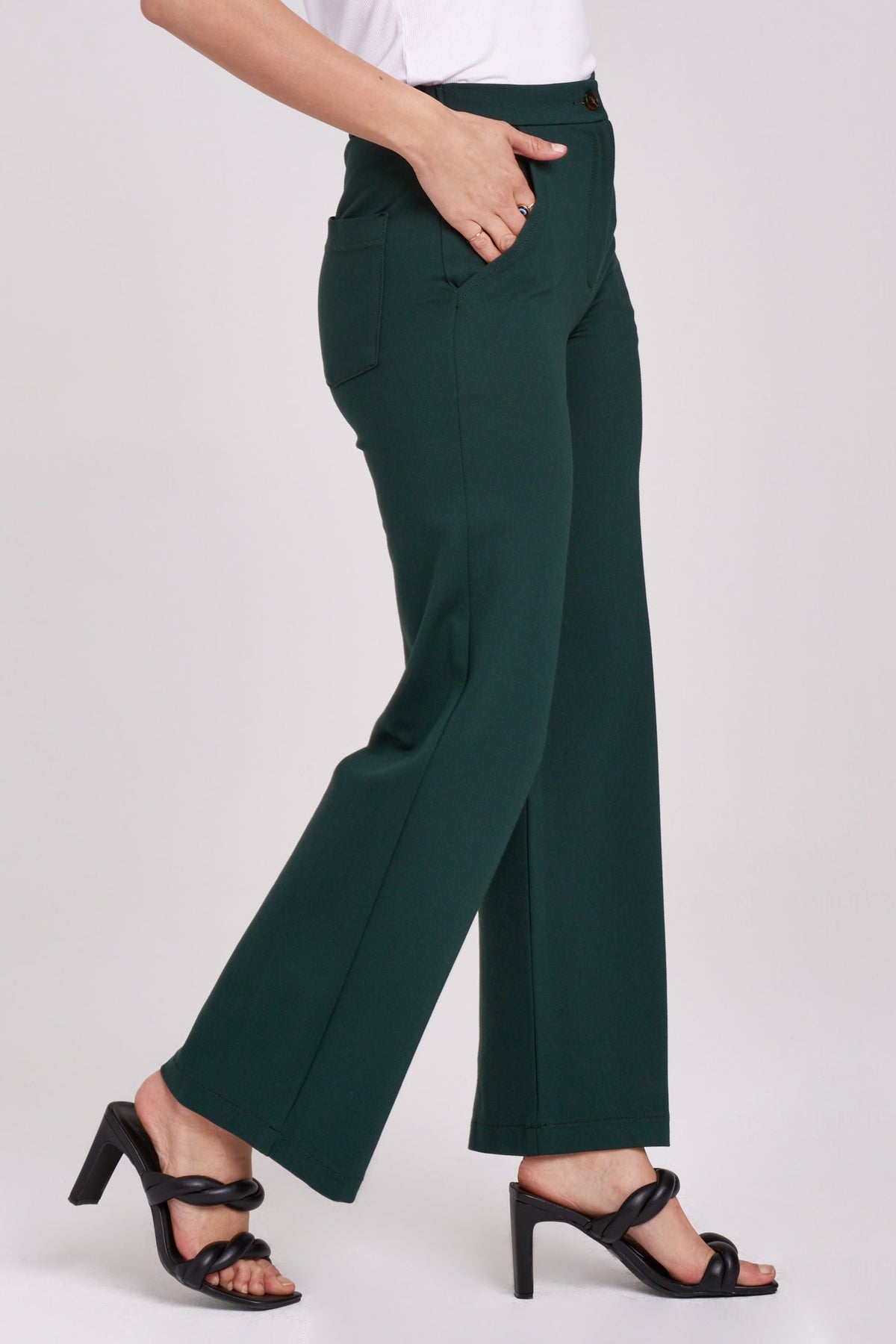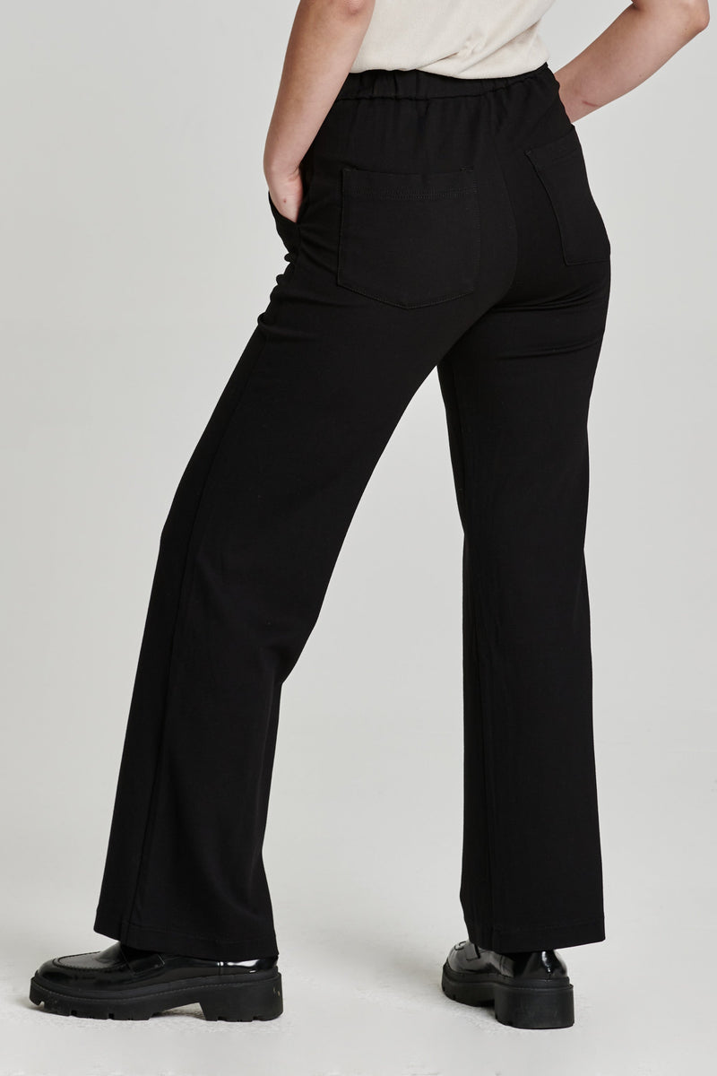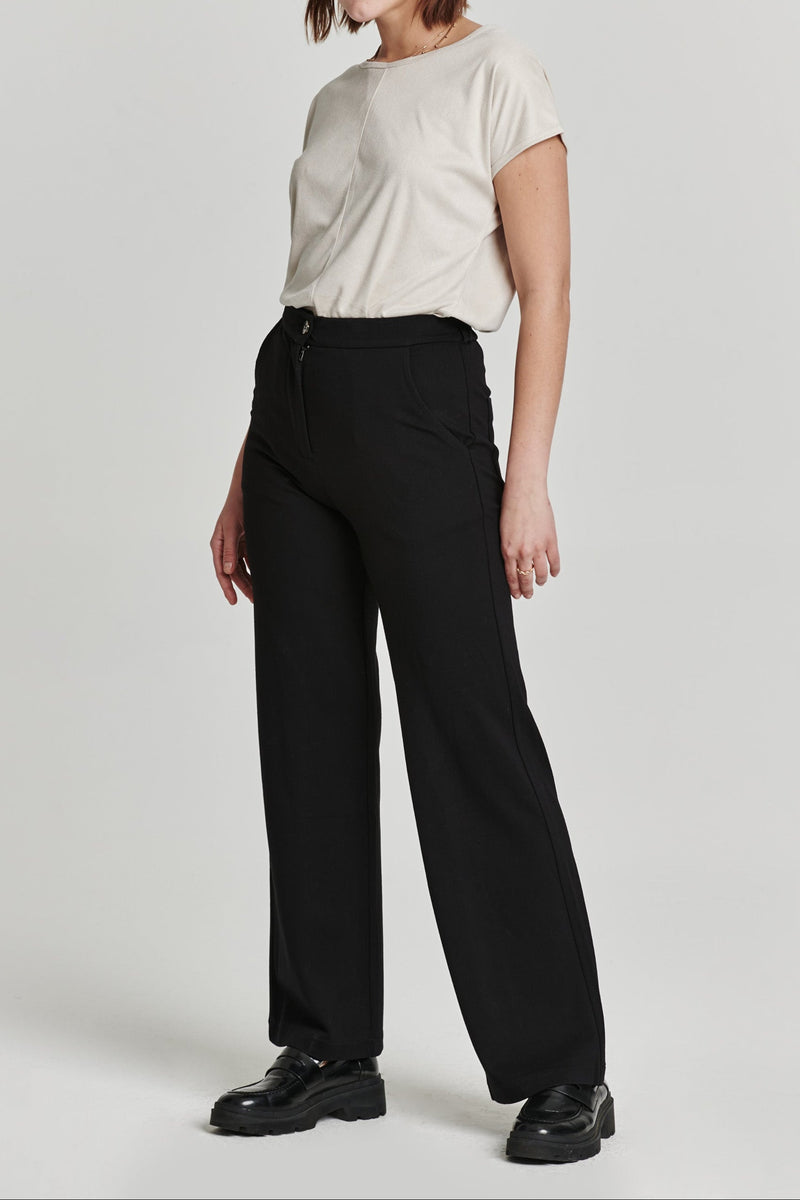 Effortless Biship wide leg pant combines style and comfort, featuring a flattering high rise and convenient front zipper and hook closure. With added comfort from the back elastic waist and practical side and back pockets, these pants are a must-have for any wardrobe.