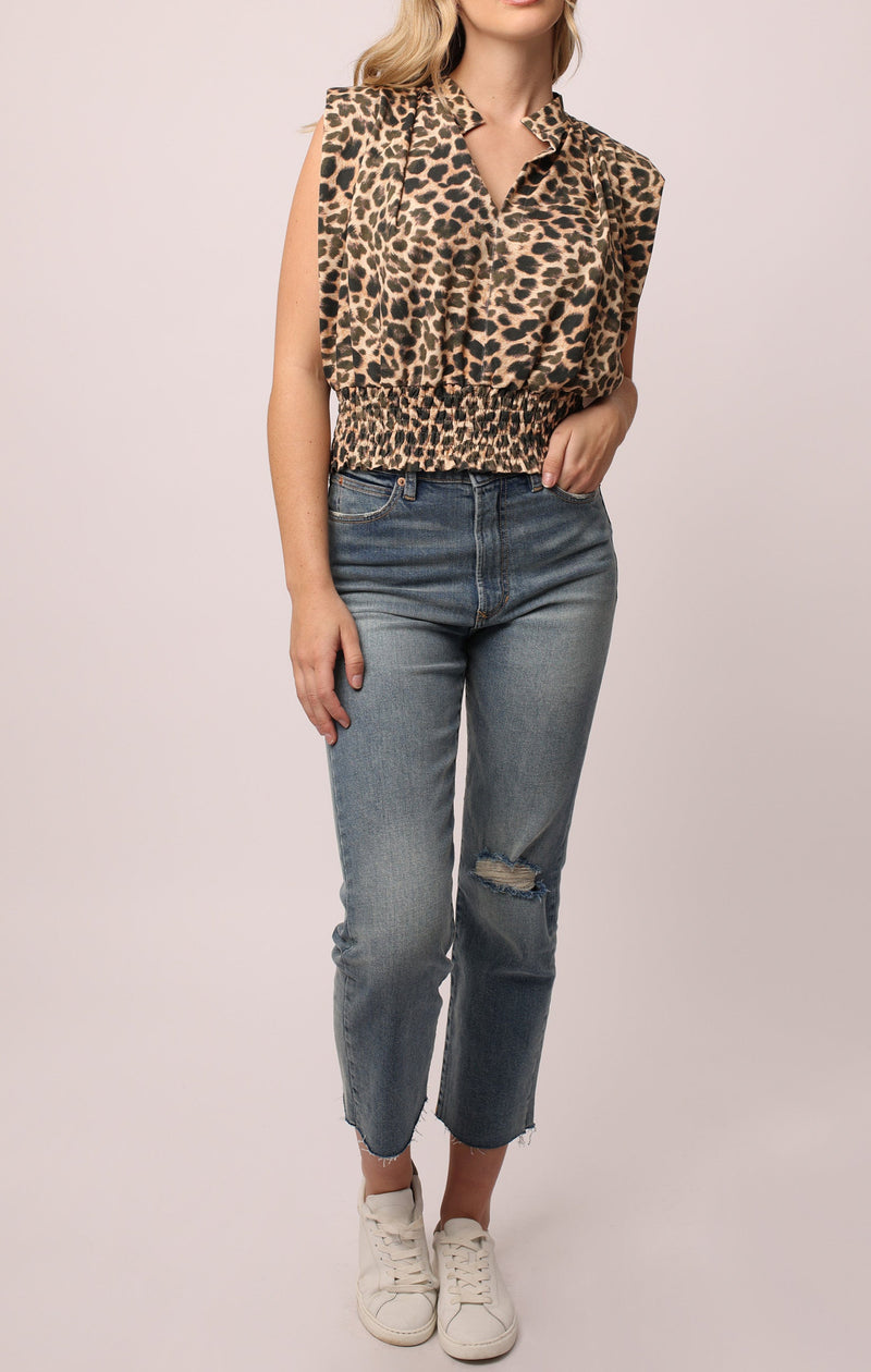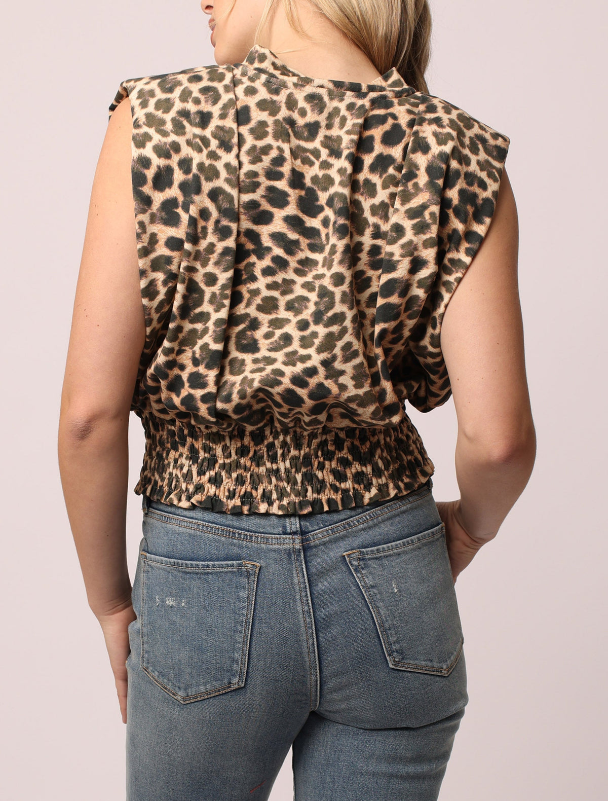 Front slit crewneck, sleeveless top with shoulder pad in printed patterns. Perfect timing! Colorful prints for that anytime, any place. Multi print knit on relaxed fit.