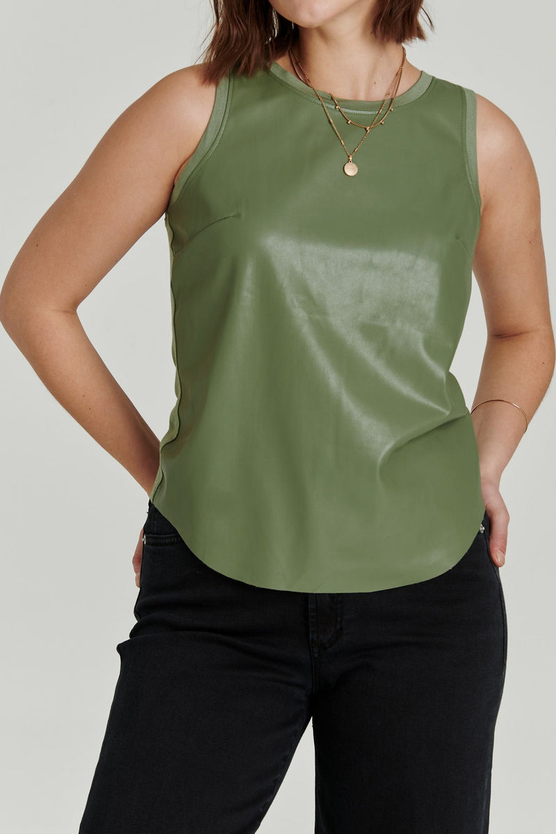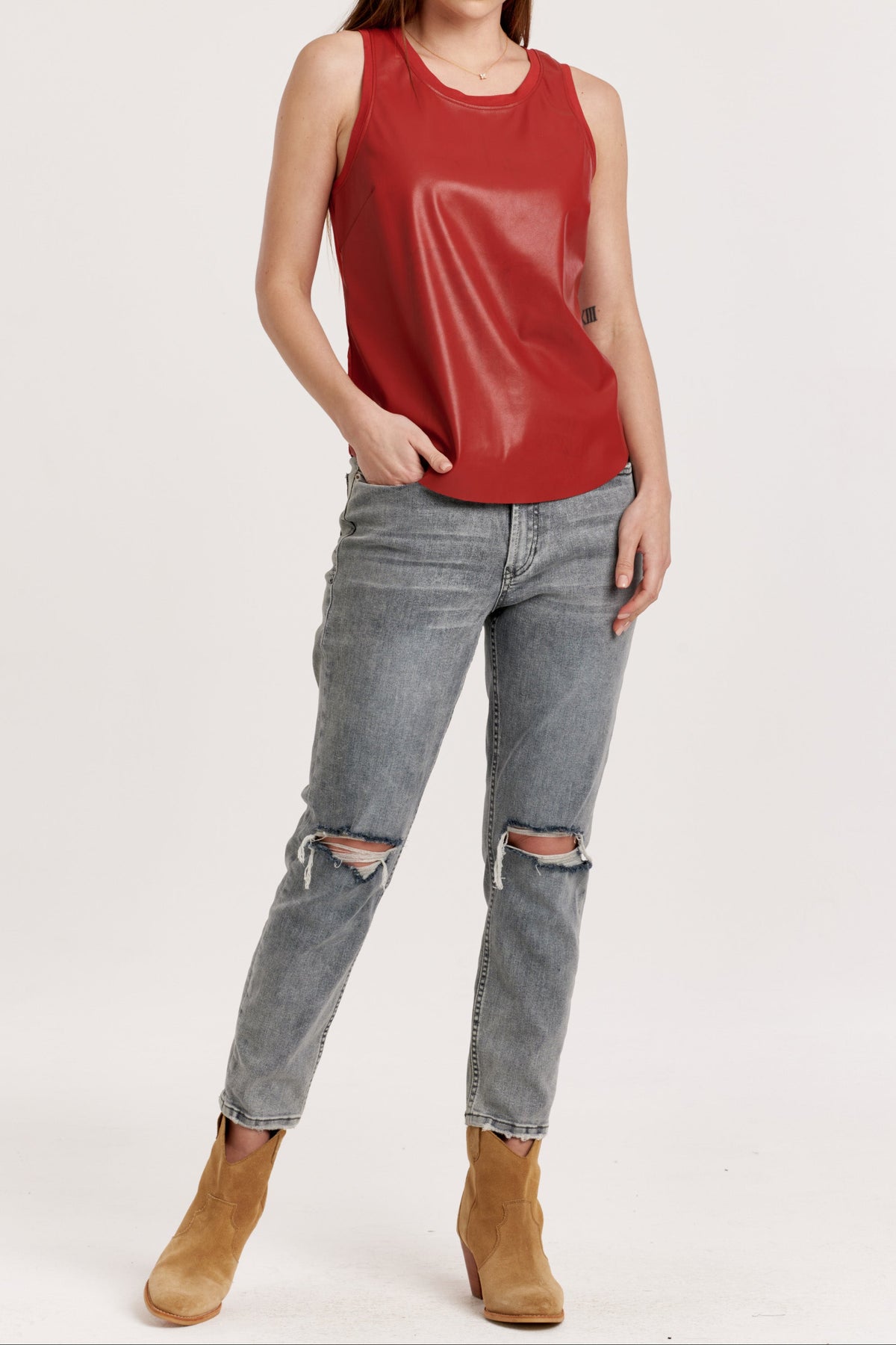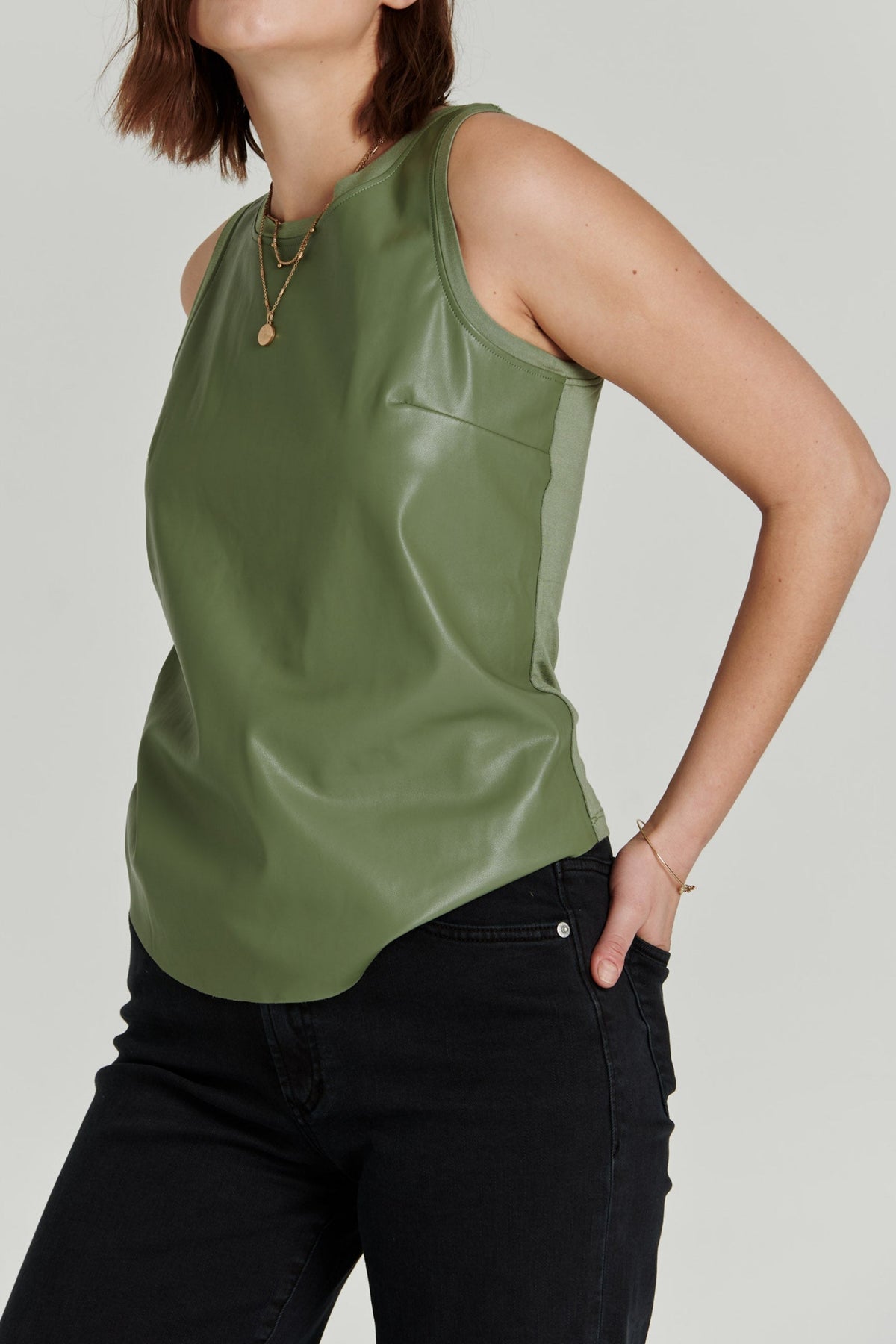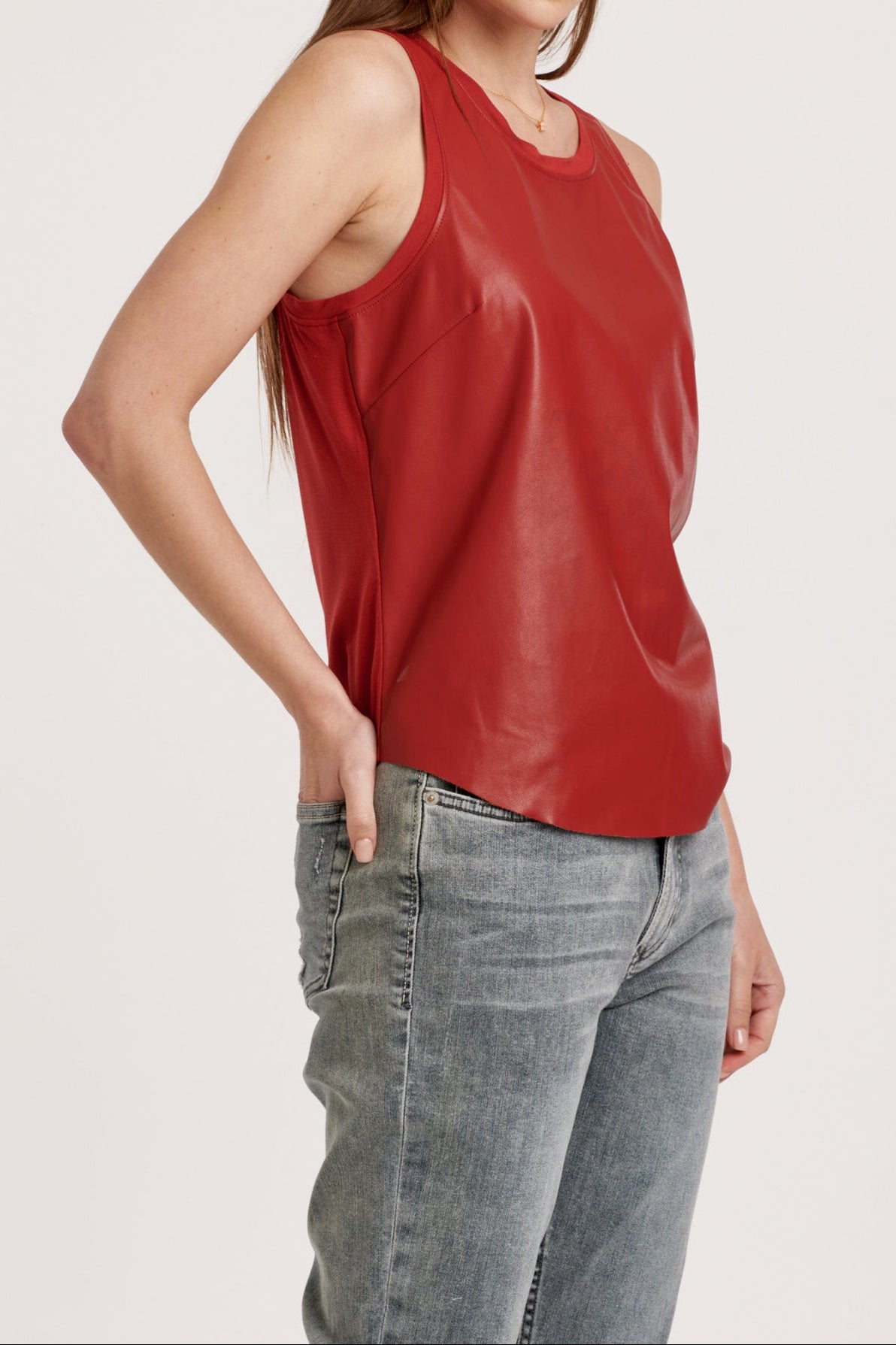 CARMELA mix media tank, v-neck finish sleeveless with armhole band & neck in vegan leather. On trend leisure for any occassion... Let's rock! Solid color pleather on standard fit.