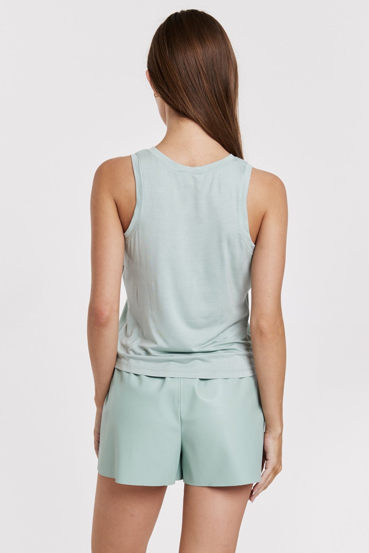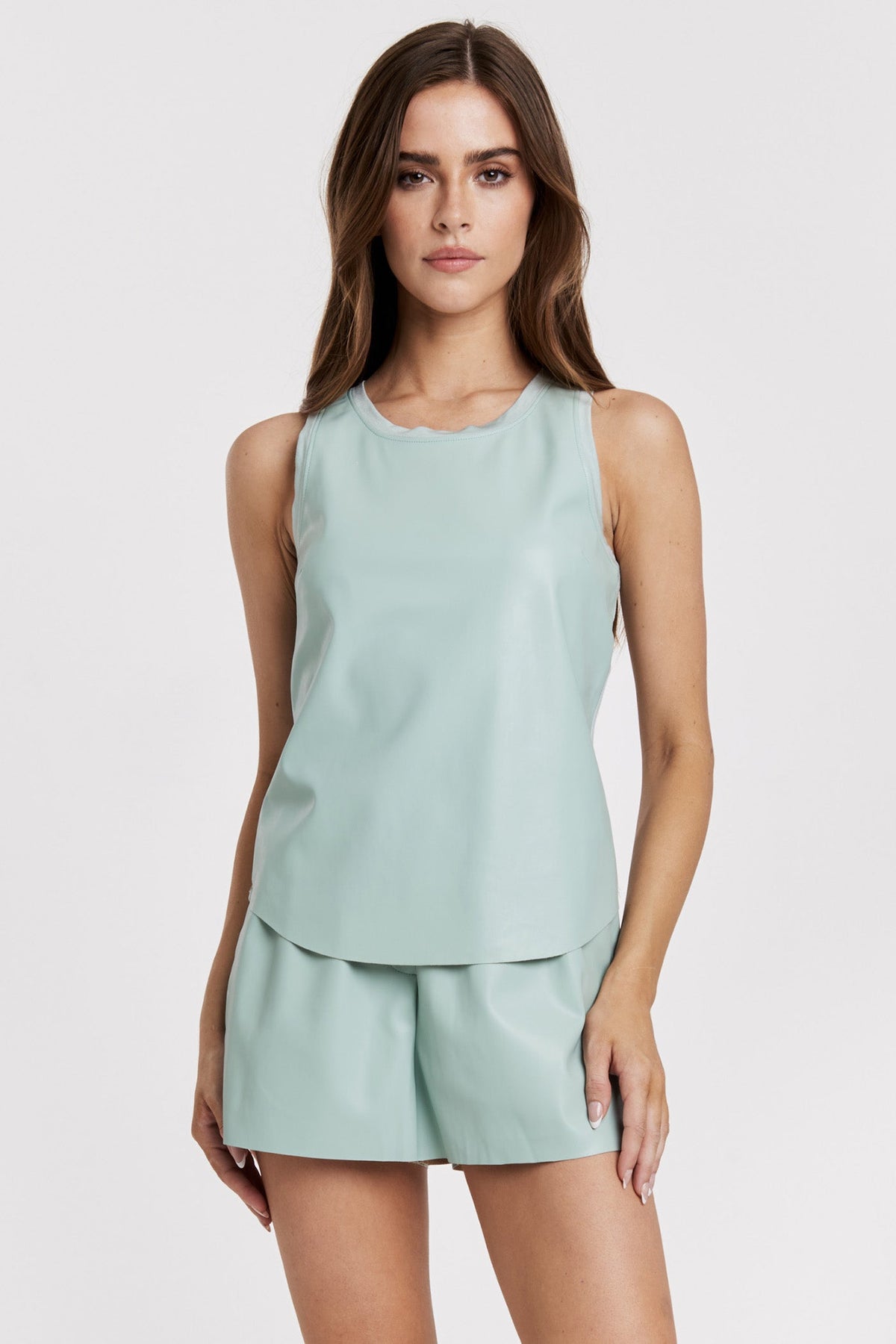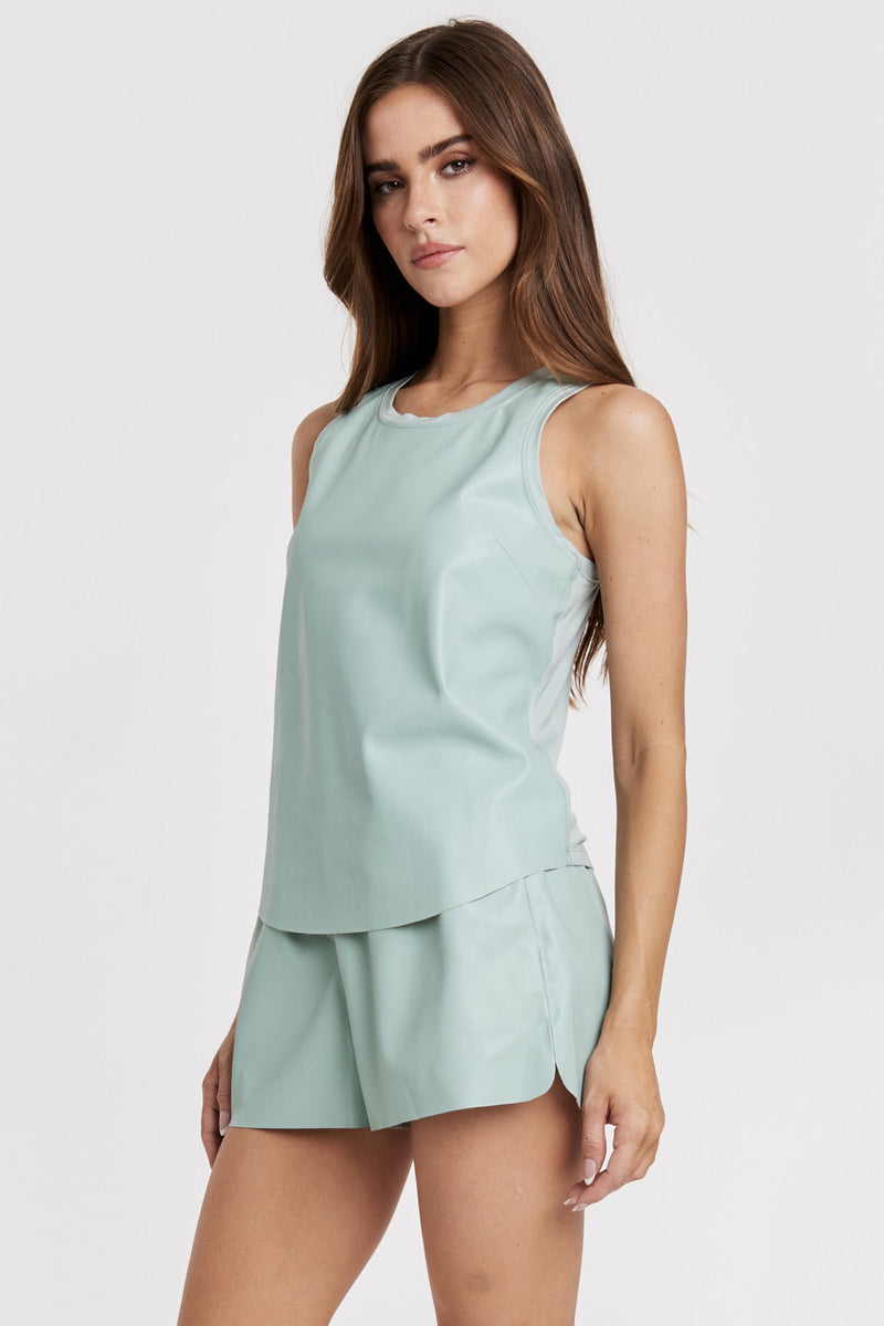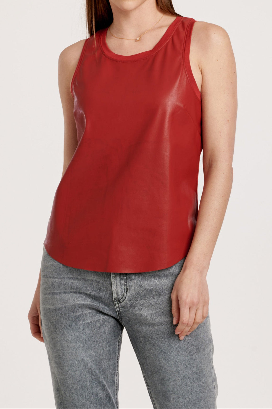 CARMELA mix media tank, v-neck finish sleeveless with armhole band & neck in vegan leather. On trend leisure for any occassion... Let's rock! Solid color pleather on standard fit.