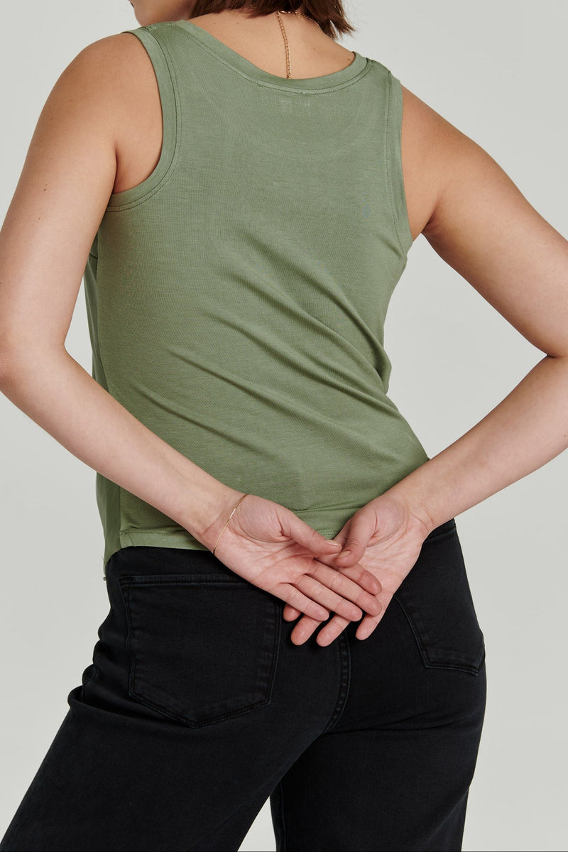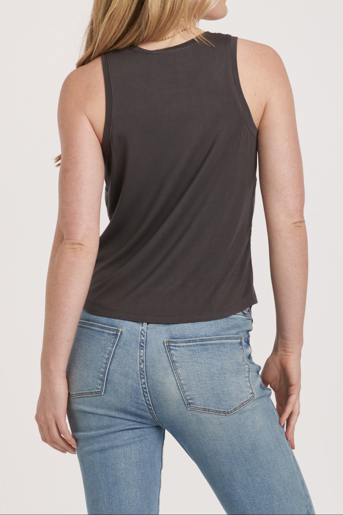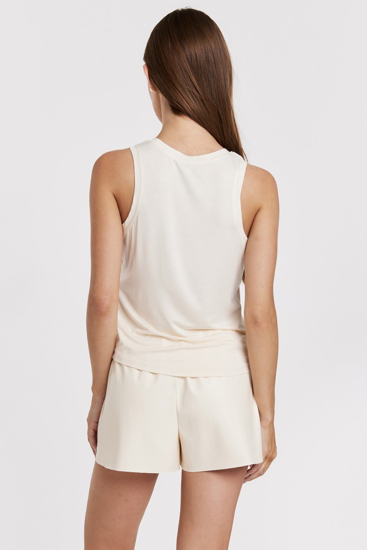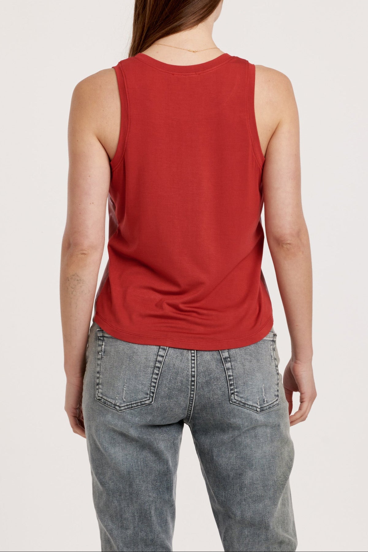 CARMELA mix media tank, v-neck finish sleeveless with armhole band & neck in vegan leather. On trend leisure for any occassion... Let's rock! Solid color pleather on standard fit.