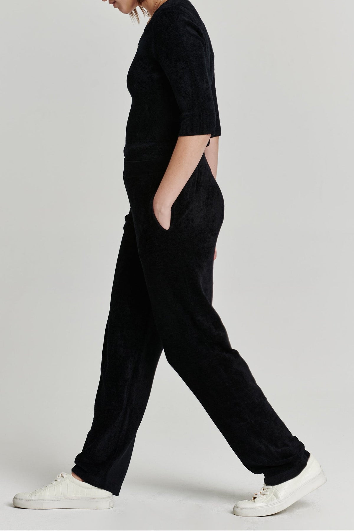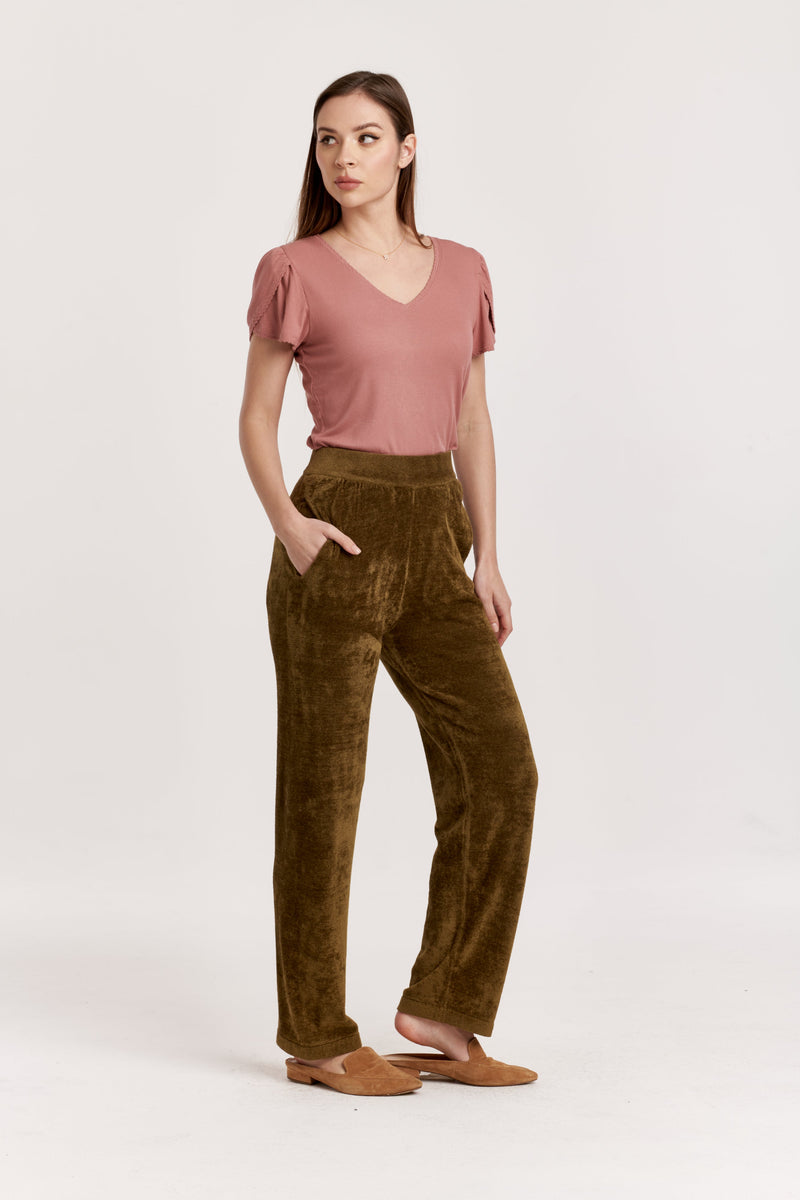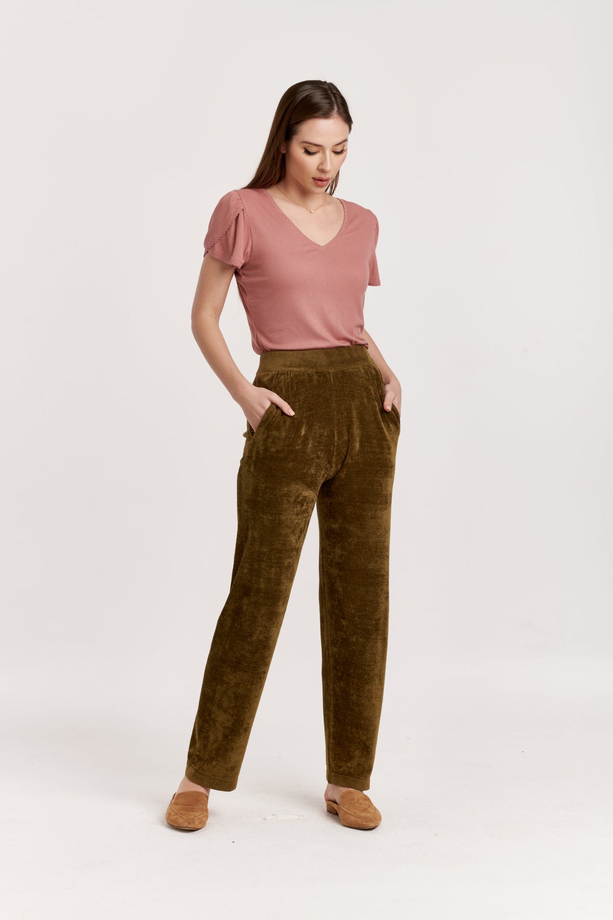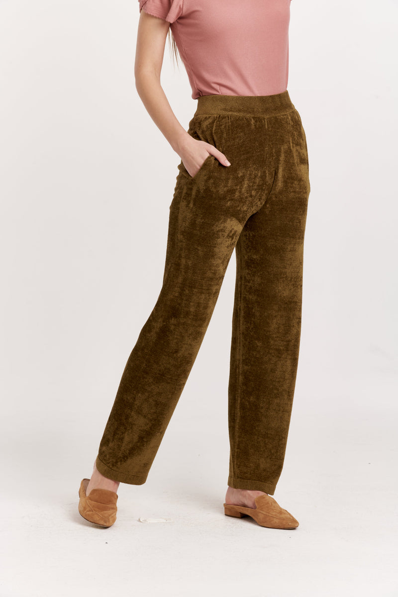 Straight leg pant, regular cut with slant pockets & elastic waist in soft pile chenille rib. Versatility of vogue pairing for any ensemble, plush pile luxury... touch of elegance! Solid color yarn on standard fit.