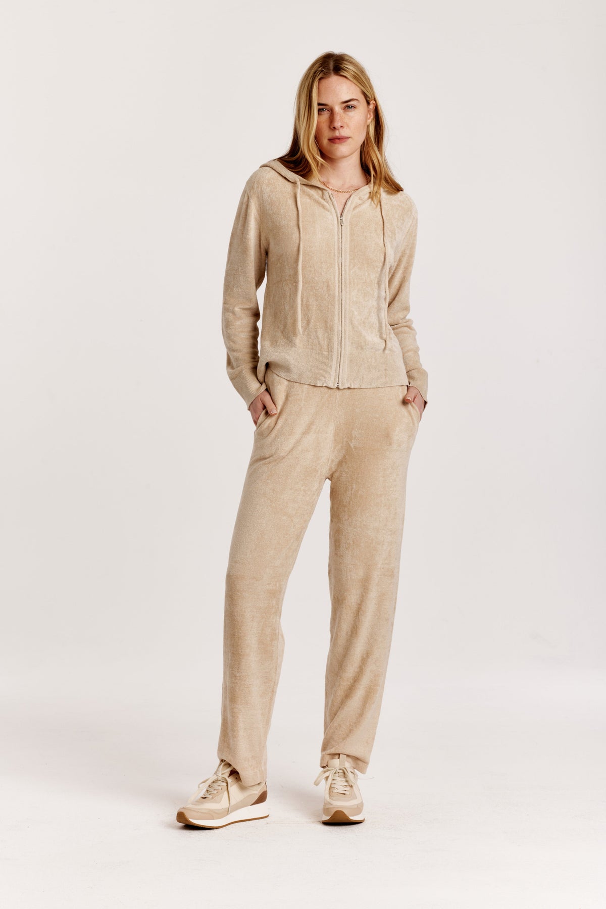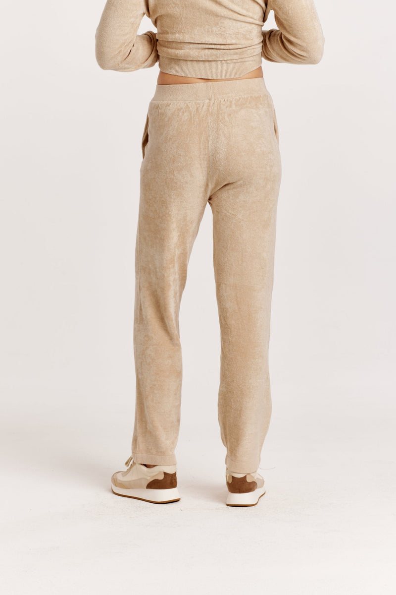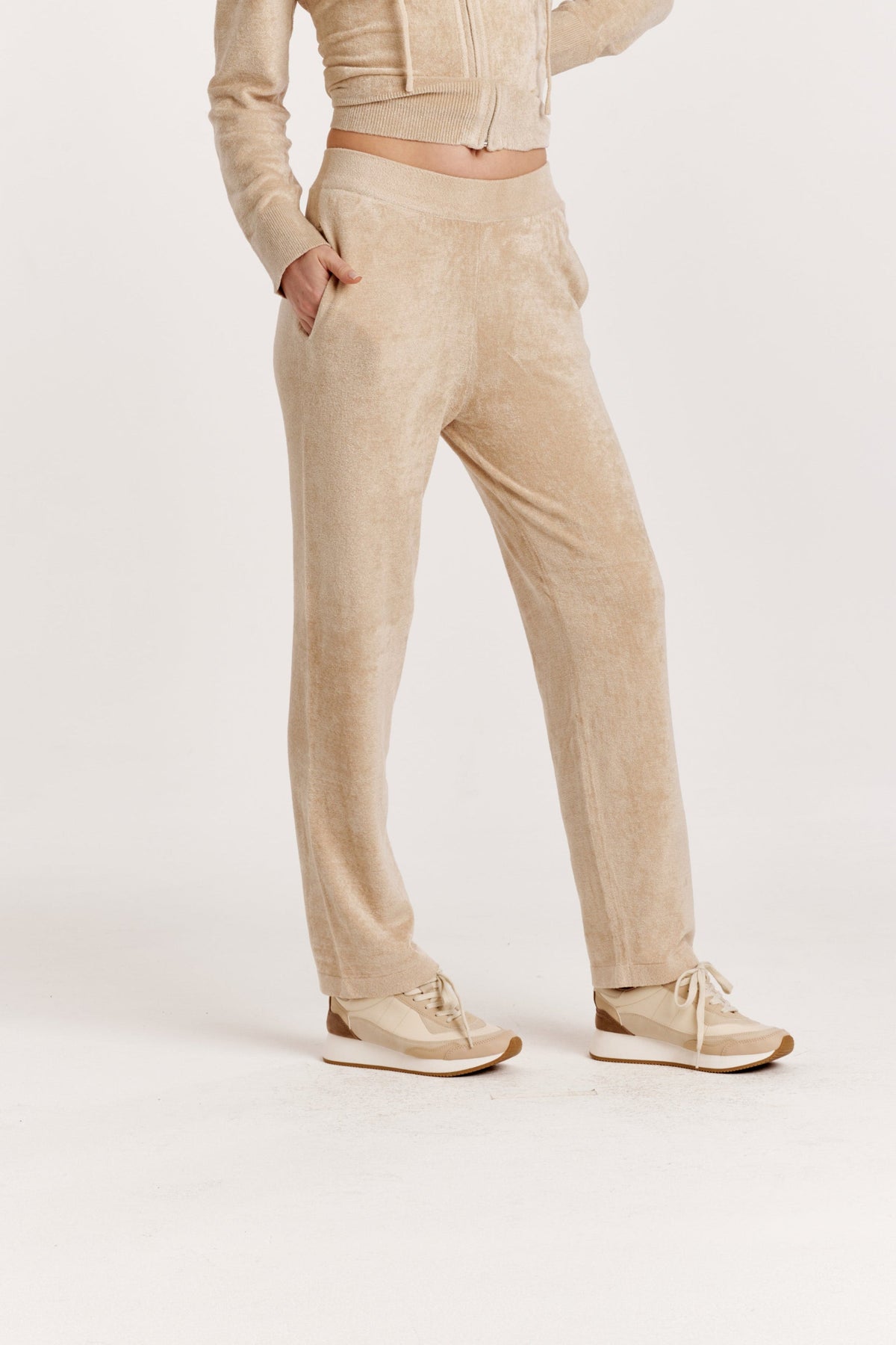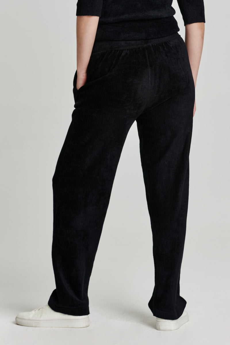 Straight leg pant, regular cut with slant pockets & elastic waist in soft pile chenille rib. Versatility of vogue pairing for any ensemble, plush pile luxury... touch of elegance! Solid color yarn on standard fit.