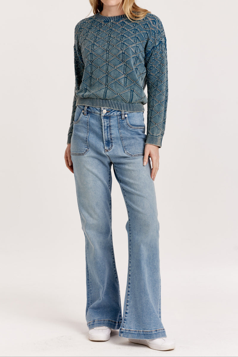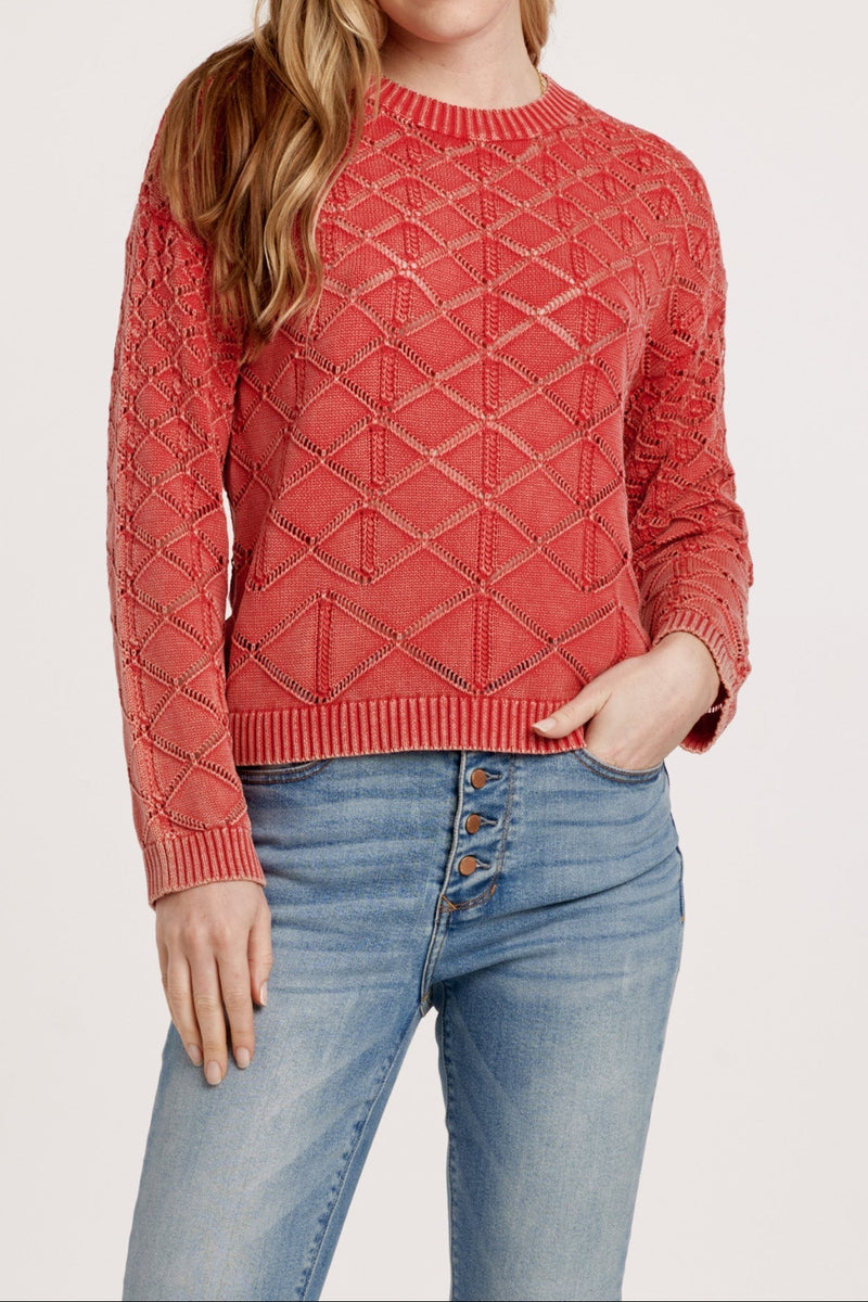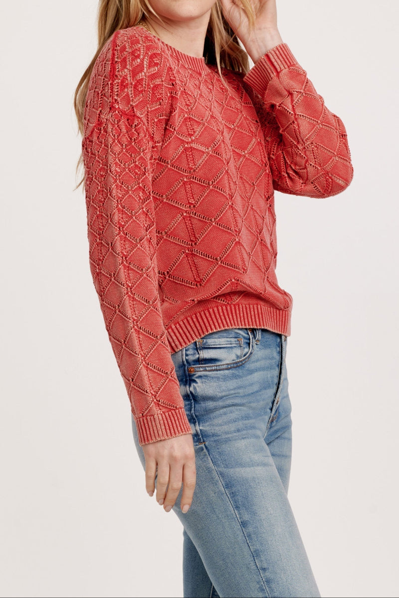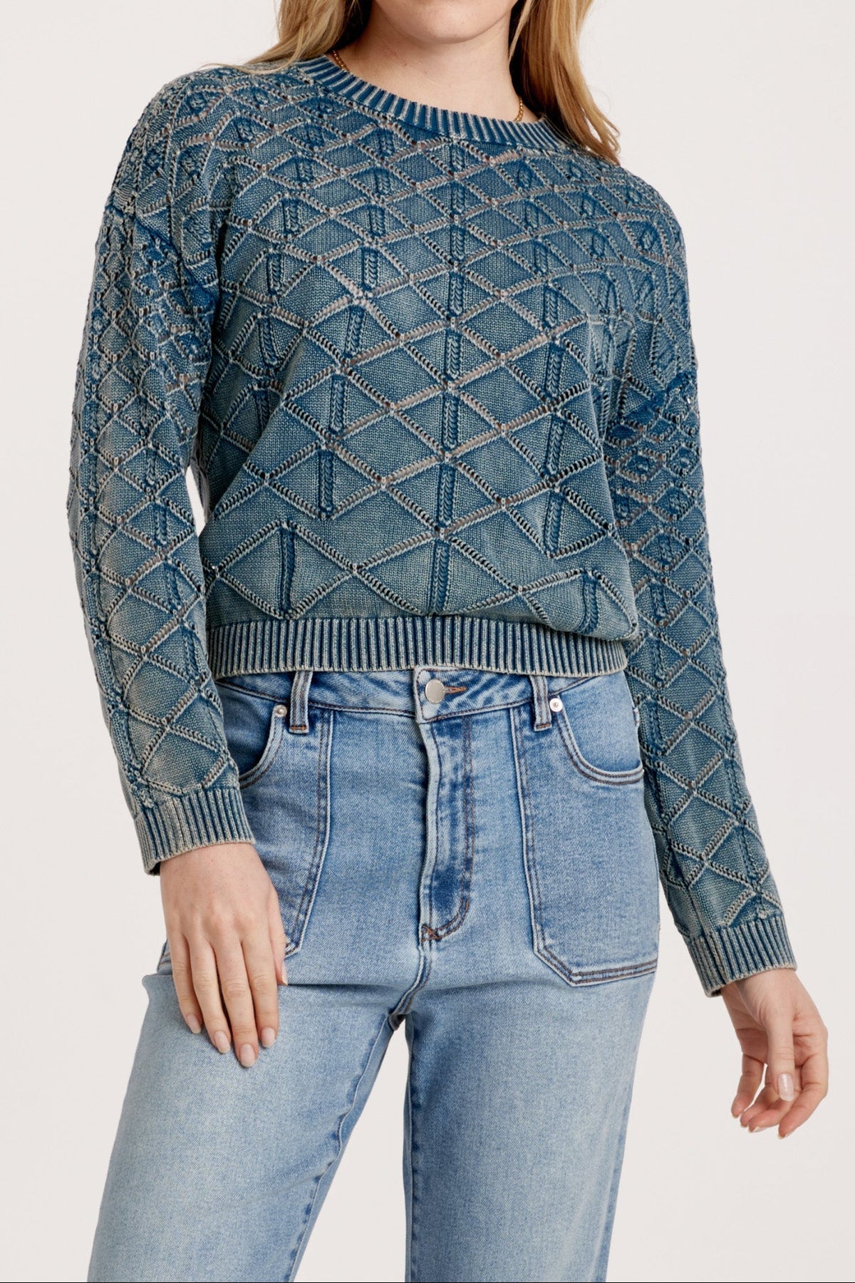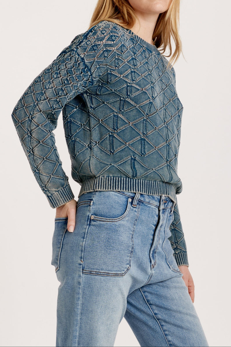 The COLETTE crew neck vintage washed sweater, long sleeve drop shoulder in angular eyelet weave finish with ribbed neck, cuffs & waistbands. Solid color yarn on standard fit. Timeless! Wash patterns is "ever-unique", the piece ever-treasured.