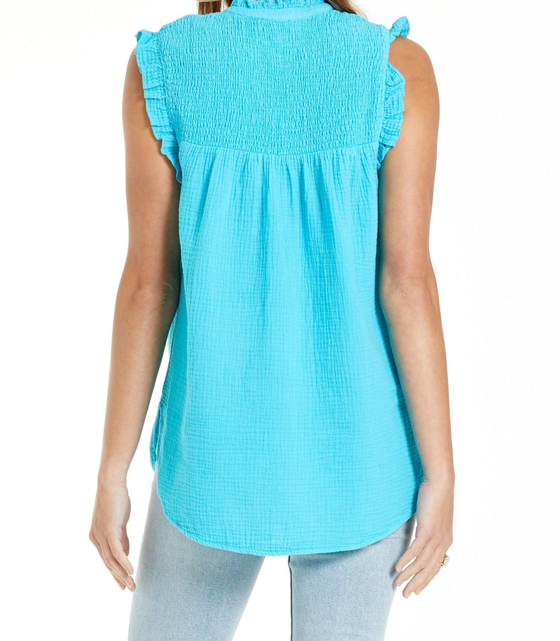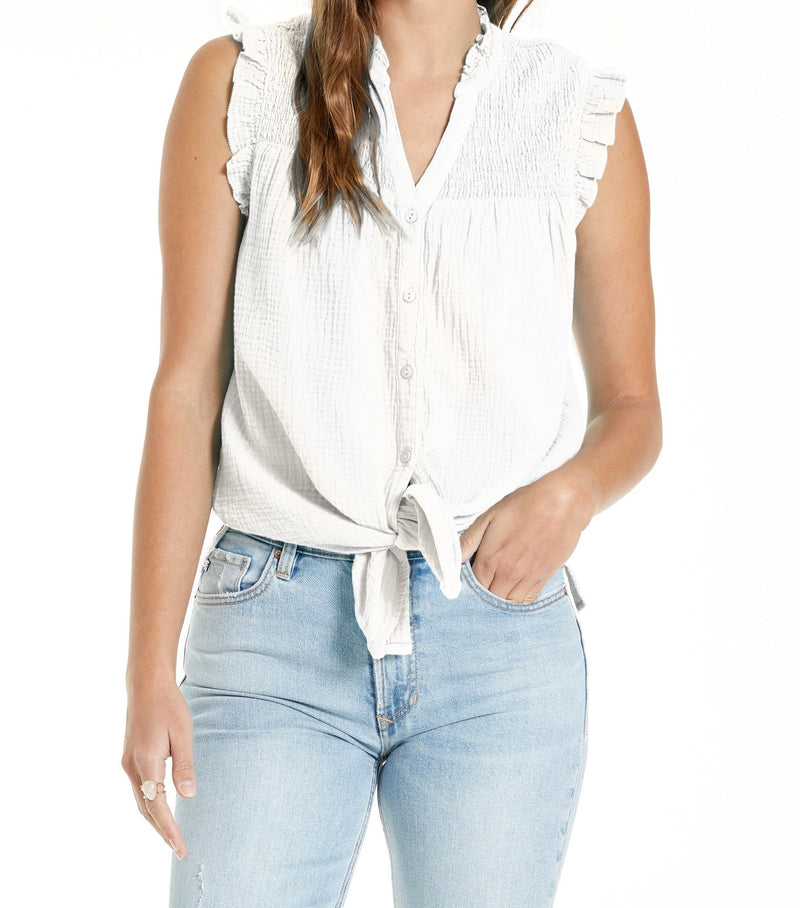 This sleeveless DANI shirt boasts a front-tie v-neck and smocked yoke detail, making it a chic and comfortable addition to any casual event. Its relaxed fit and solid color lend a touch of understated elegance to your wardrobe.