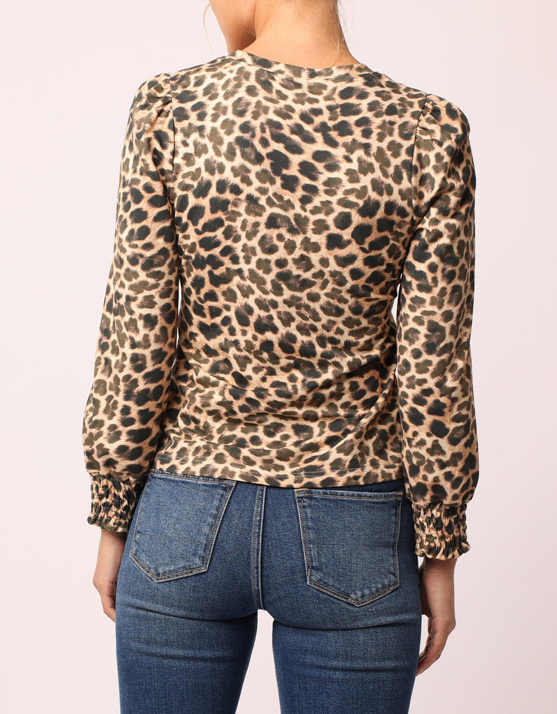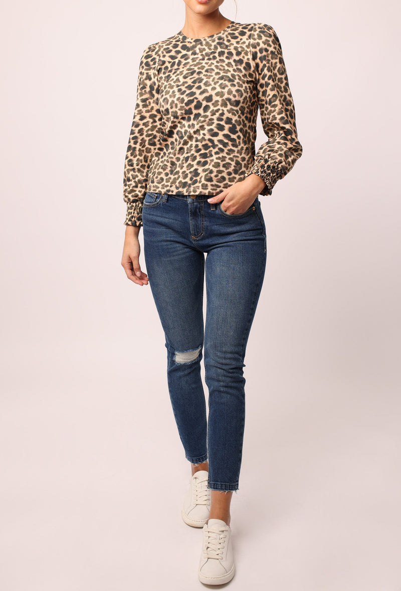 Crewneck, long sleeve top with shirred shoulder & smocked cuff in printed patterns. Perfect timing! Colorful prints for that anytime, any place. Multi print knit on standard fit.
