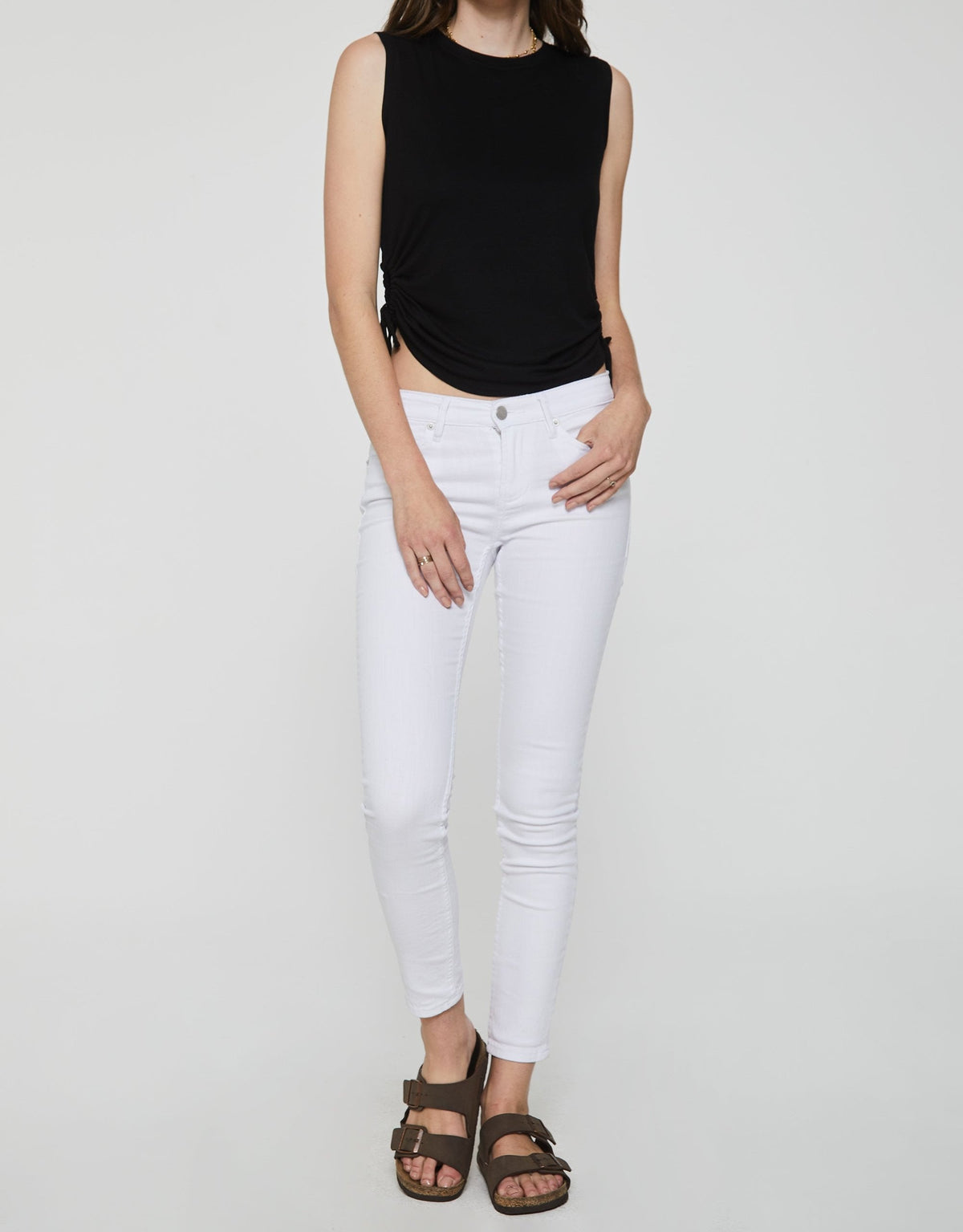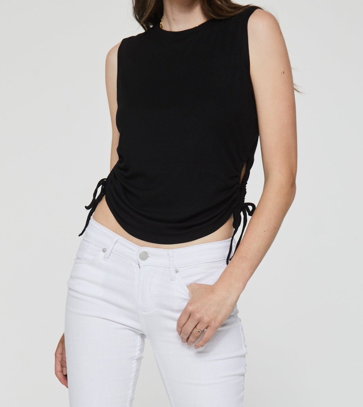 FLEUR rib side ruched tank with keyhole & self tie, crewneck finished sleeveless. One of a kind, peek-a-boo side keyhole to acceturate your perfect form, engagement for any lifestyle... Solid color knit on standard fit.