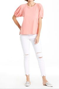 Puff short sleeve crew neck top finished raglan and elastic cuff. Solid color knit on regular fit, styled with solid color binding neck.
