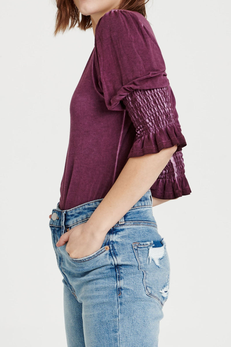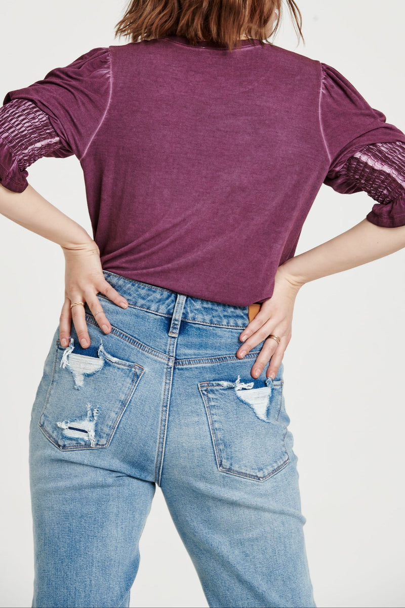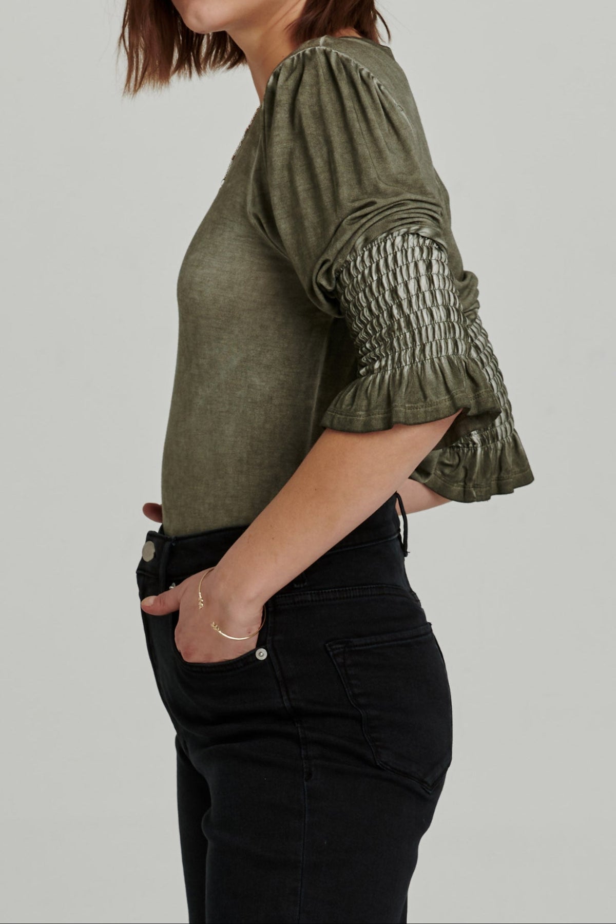 Retro ruffles and smocked cuffs adorn the HARI top with an antique "wash of art" that's oh-so-classy and treasured. The antique finish adds character, while the knit material and standard fit keep it versatile and stylish. Perfect for anyone with a love for unique and playful fashion.