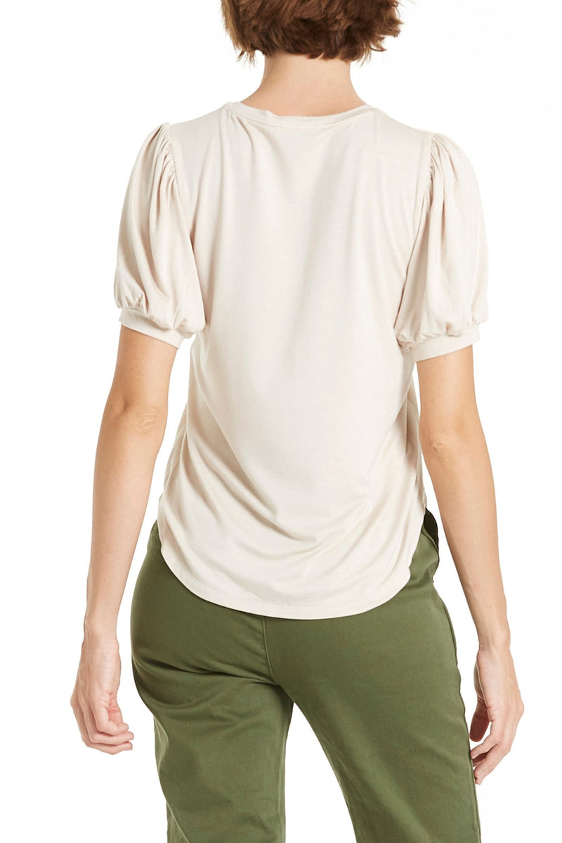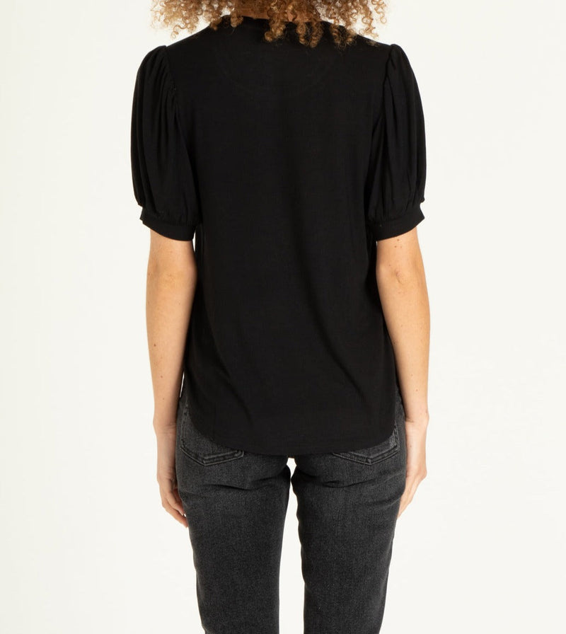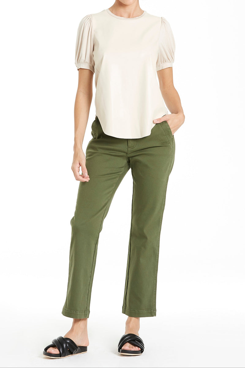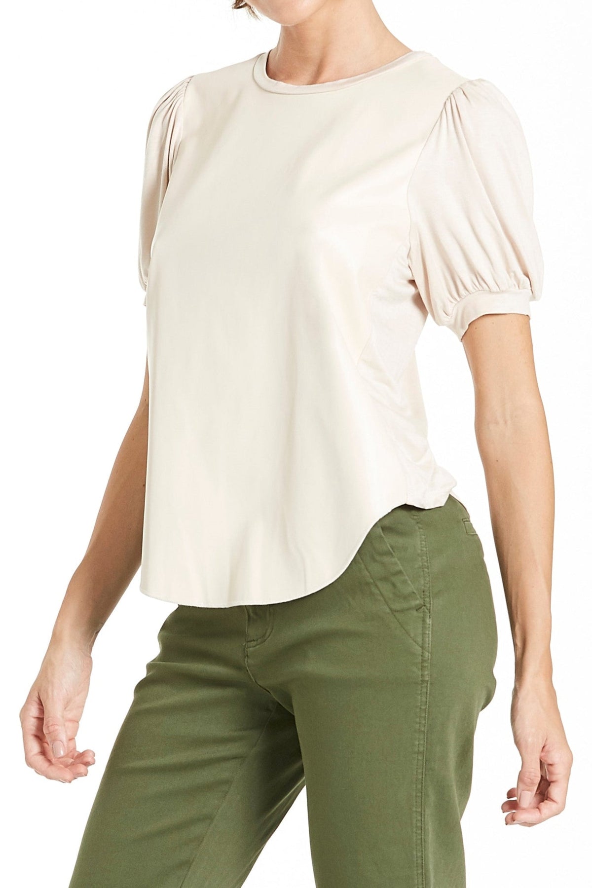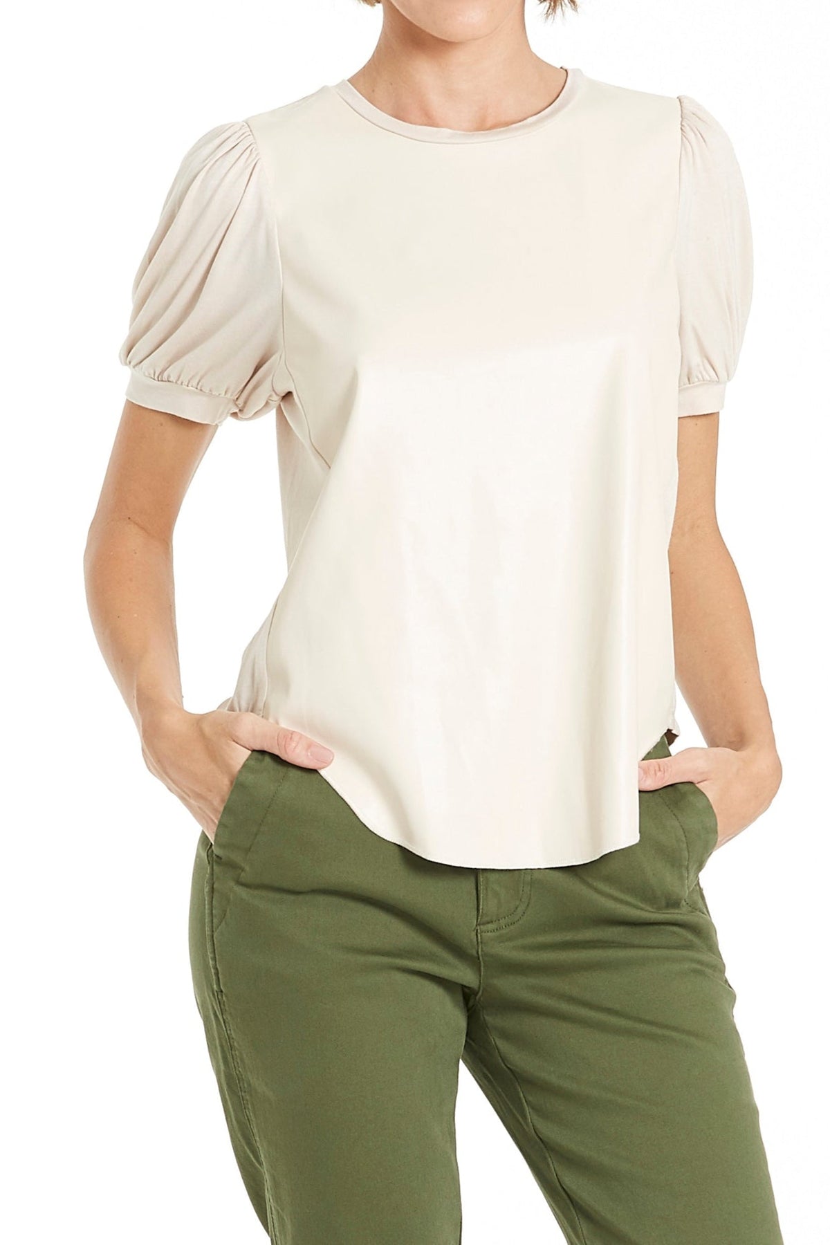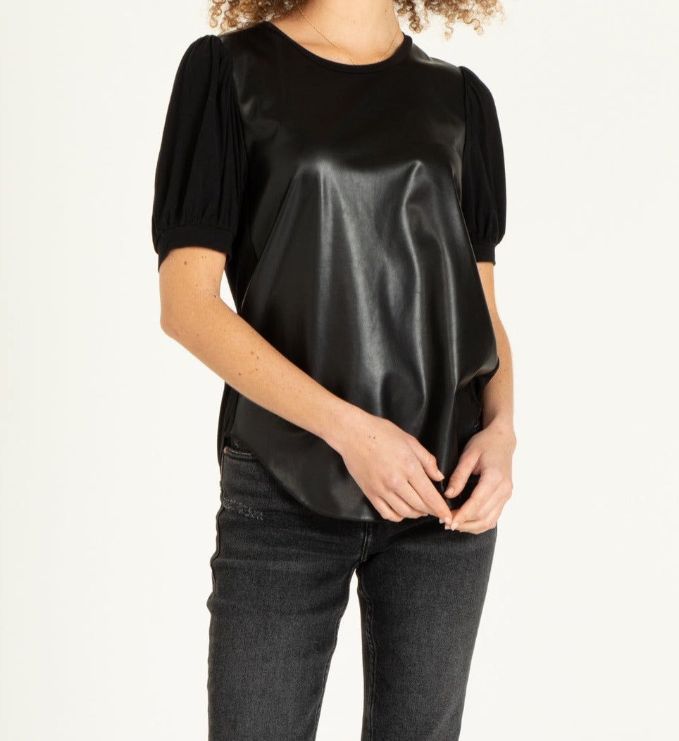 Pleather front panel, shirred shoulder, short sleeve crew neck top finished with merrow and curved hem. Solid color woven on regular fit, styled with self neck and cuff band.