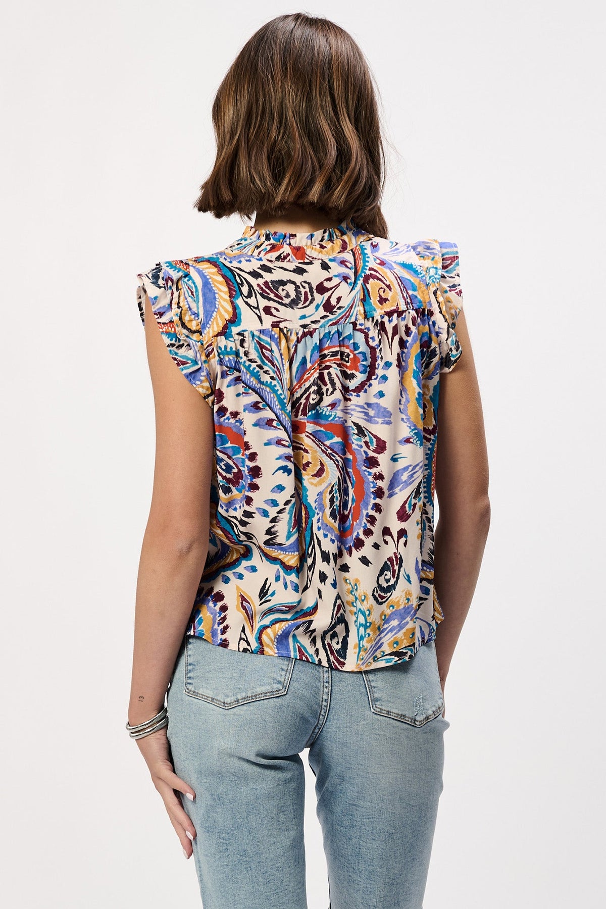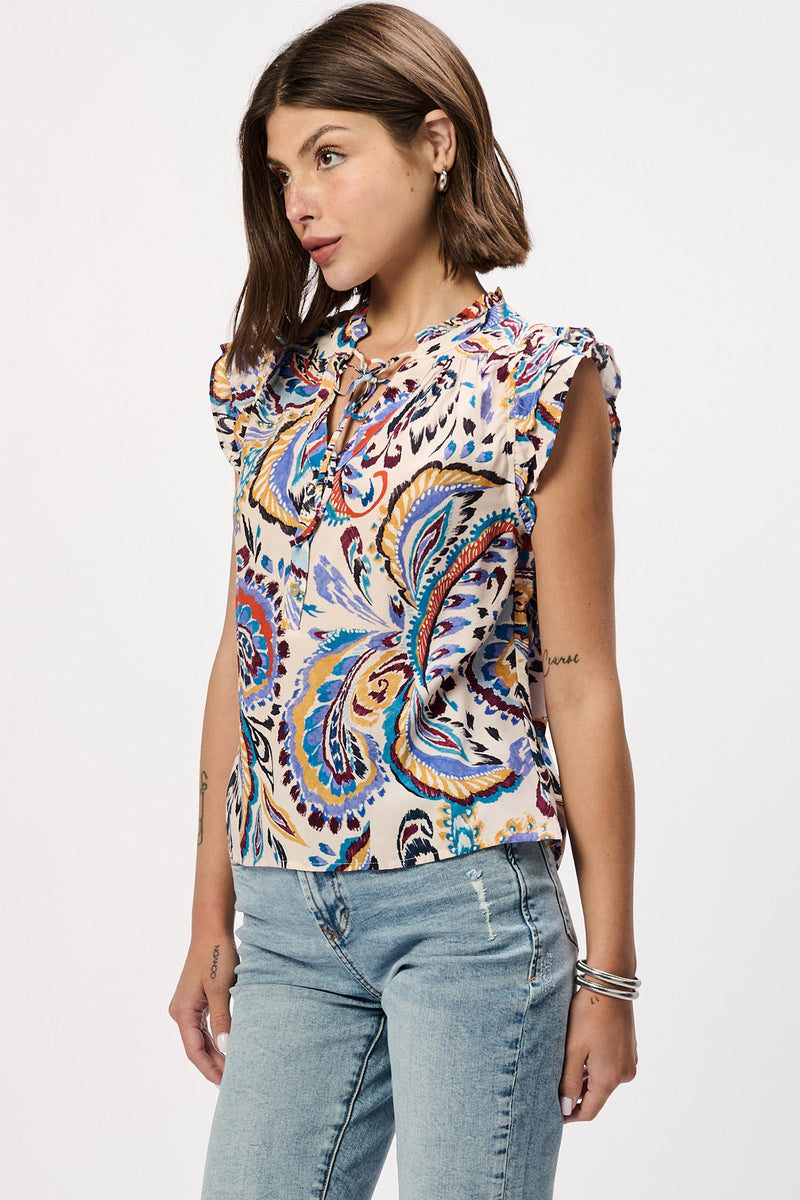 Effortless elegance with the Jinora novelty top in Sunset Paisley Bliss print, featuring delicate double ruffle sleeves crafted from 100% rayon for breathable comfort and luxurious drape. This versatile piece in relaxed silhouette is offering a polished look for any occasion with natural ease and charm.