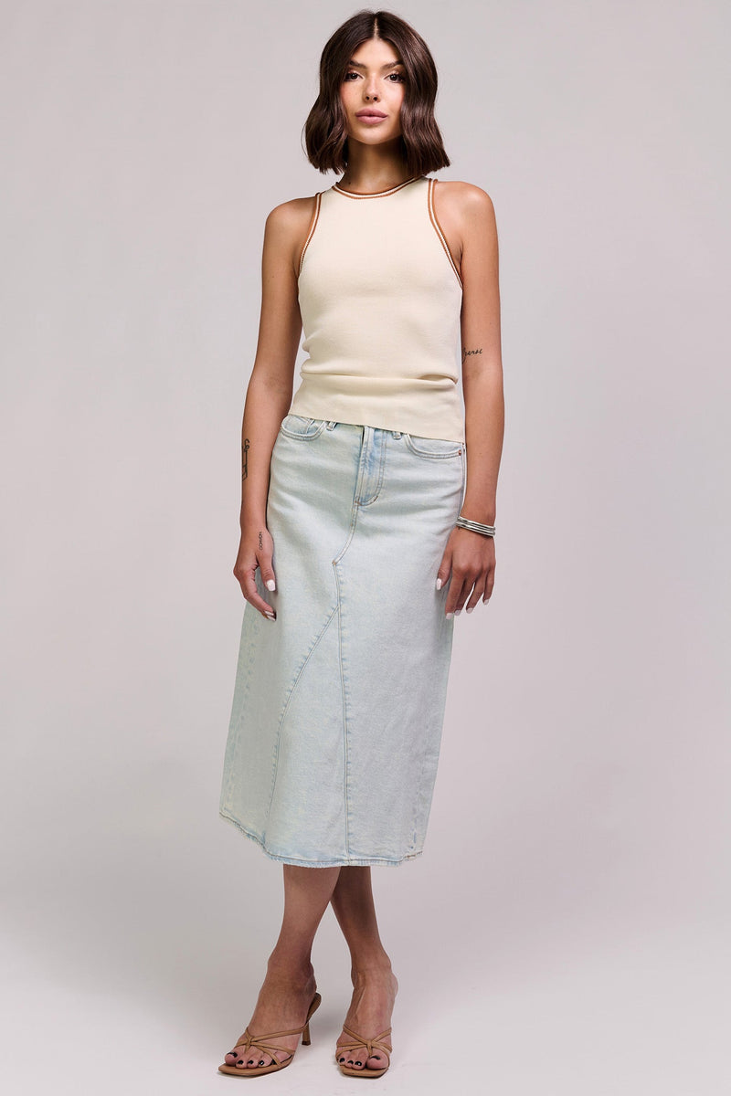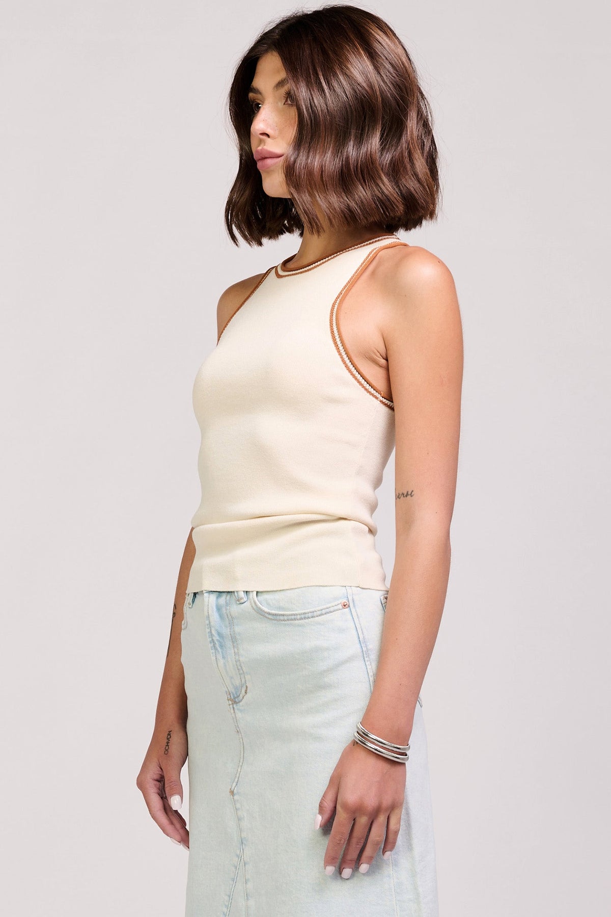 The chic elegance in the Mariah crew neck tank, featuring delicate crochet detail and a flattering silhouette crafted from a blend of 50% viscose, 38% polyester and 12% nylon for soft comfort. This versatile piece offers elevated style embodying the essence of simple, graceful, fashion.