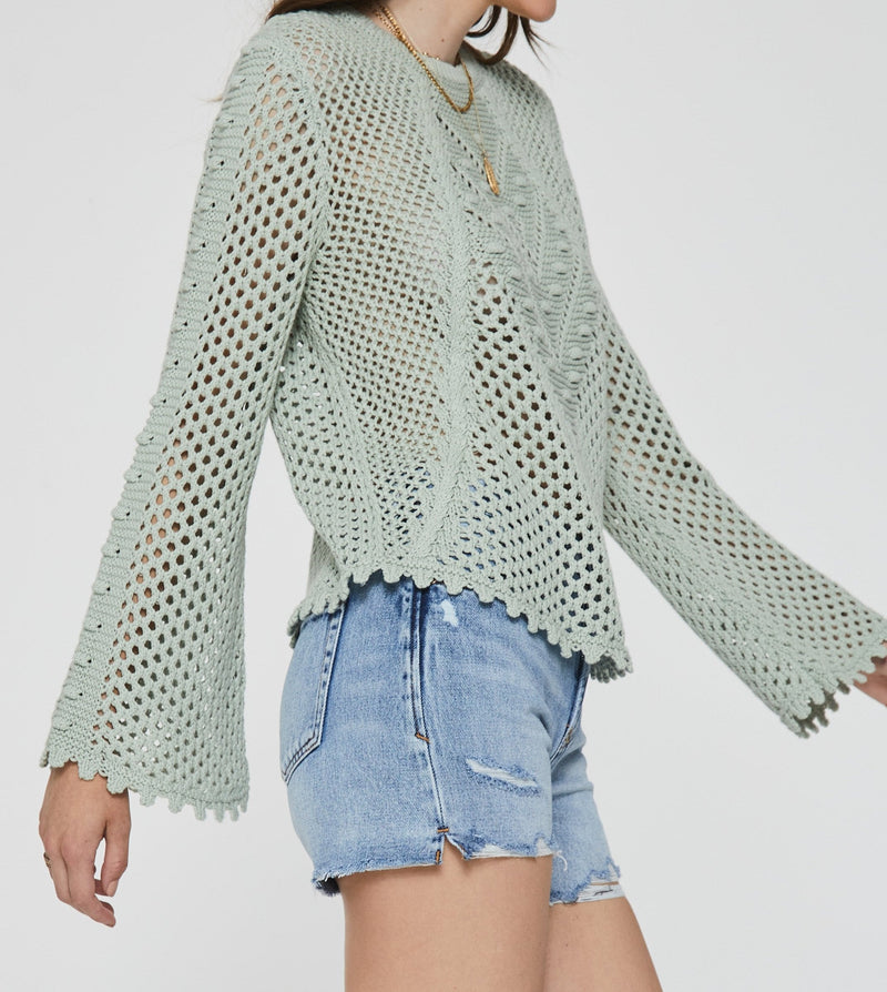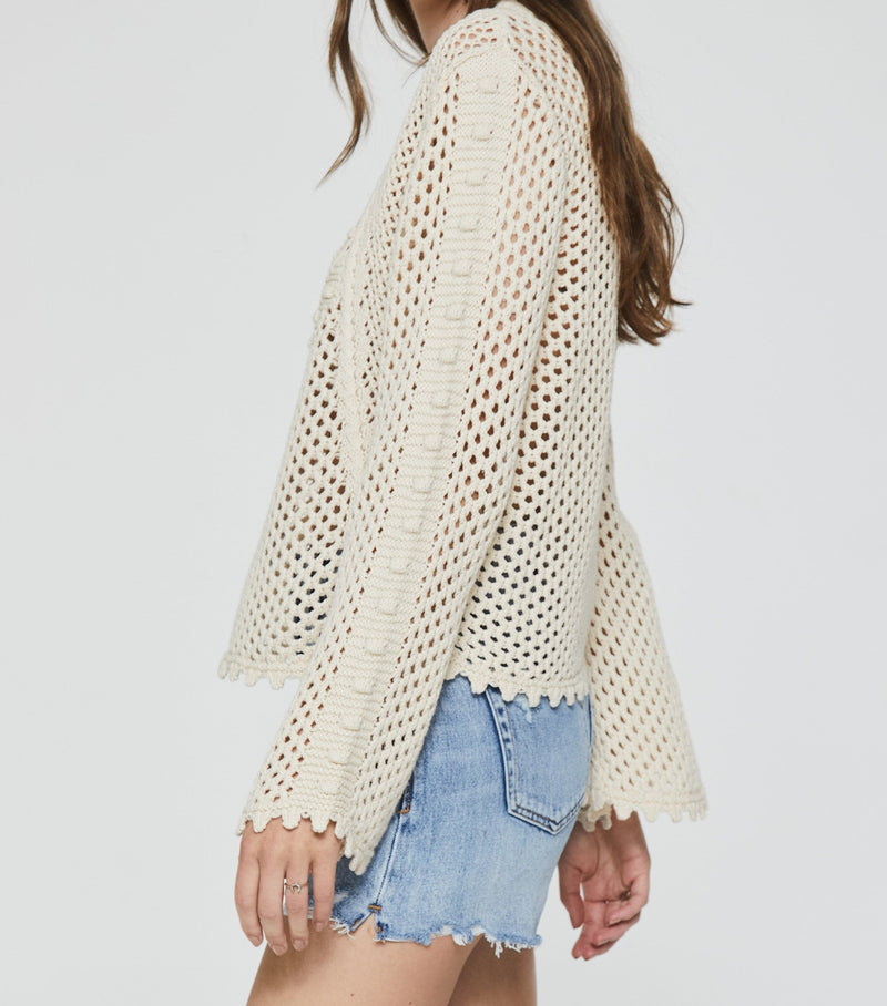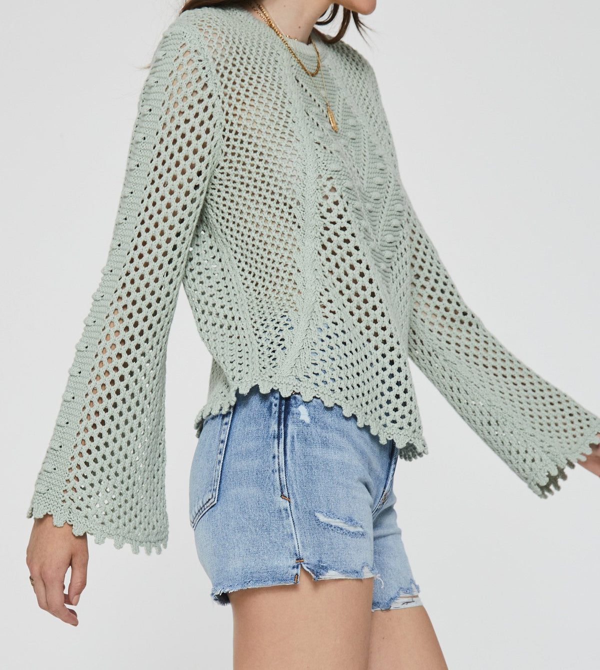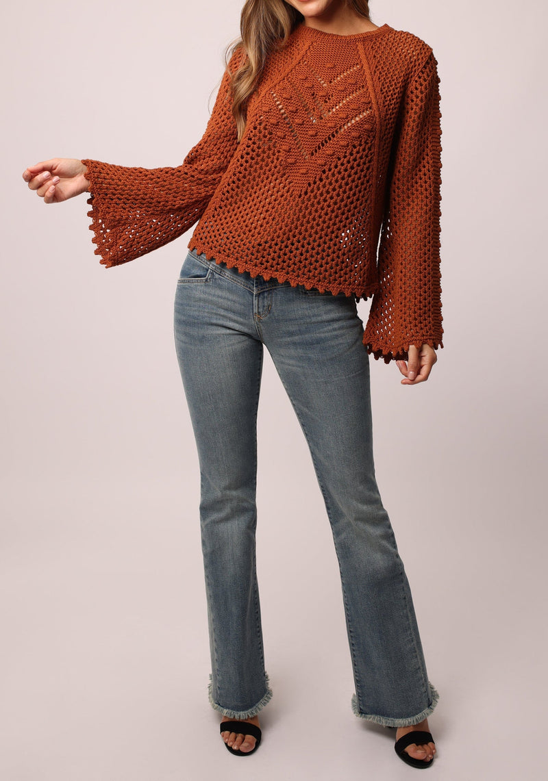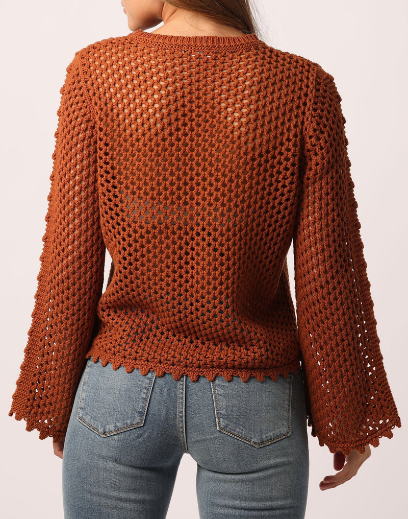 This MERYL SWEATER features delicate pointelle eyelet details with a crew neck, mesh embroidery, and long flare sleeves. Its relaxed fit and solid color yarn make it a perfect pairing for any style, adding a touch of cuteness and on-trend vibe to your look.