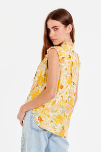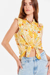 Tie front shirt with back pleating, button front finished sleeveless with ruffle, curved side vent, collar stand in contemporary floral print. Blooming floral of life's optimism, ever rosy & just cheerful! Multi print woven on standard fit.