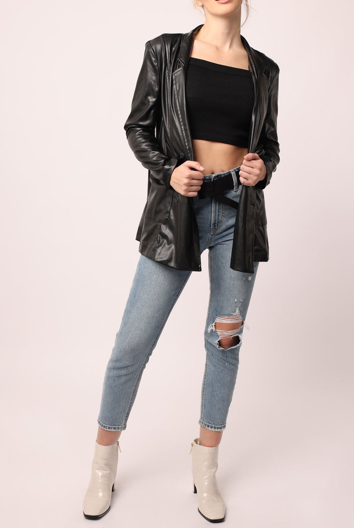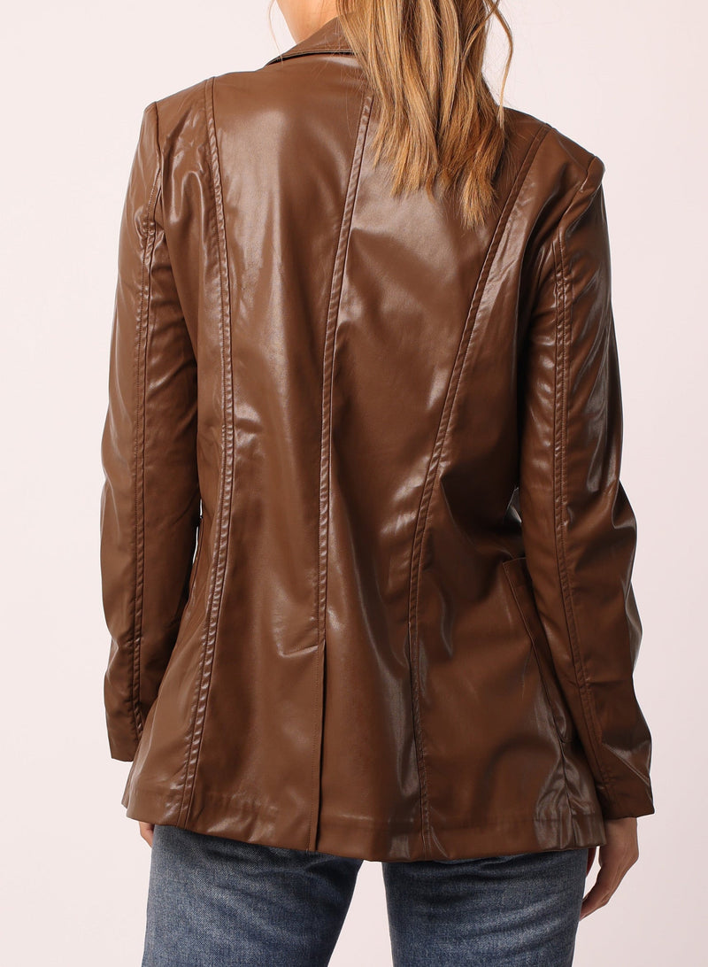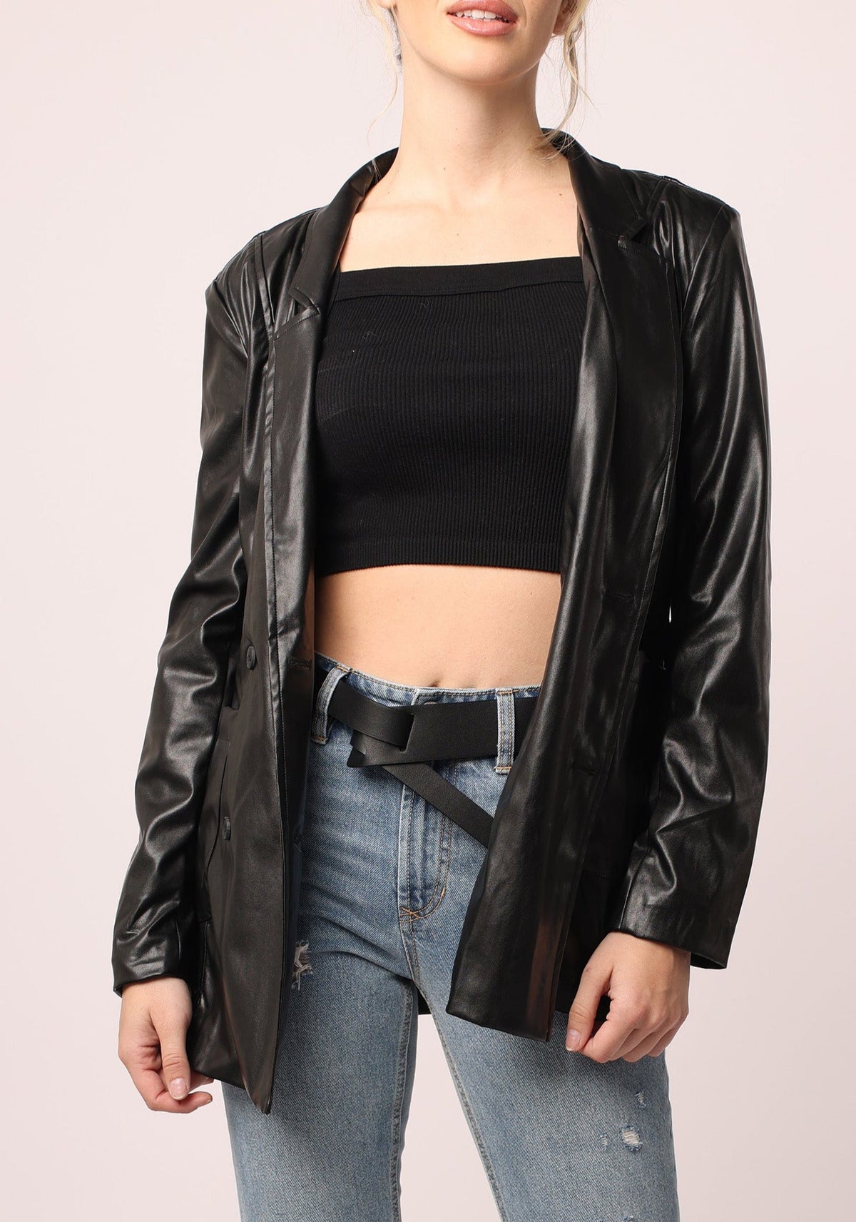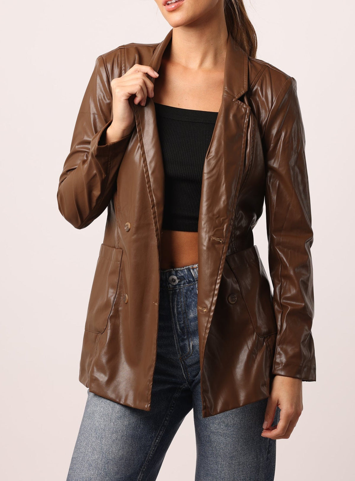 The PAIGE blazer is an edge to your wardrobe with this vegan leather blazer. Featuring a double-breasted lapel, long sleeves, and patch pockets, it's the perfect blend of chic and formal. Plus, it's made from solid color vegan leather for a versatile and stylish look.