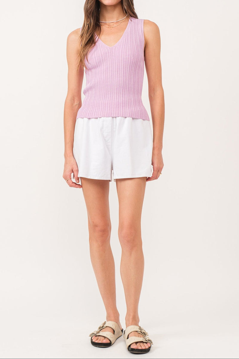 PEONY v-neck tank in variegated stretch rib finished with edge hem. Soft, cozy, versatile rib tee, the perfect blend for your lifestyle... Solid color knit fitted.