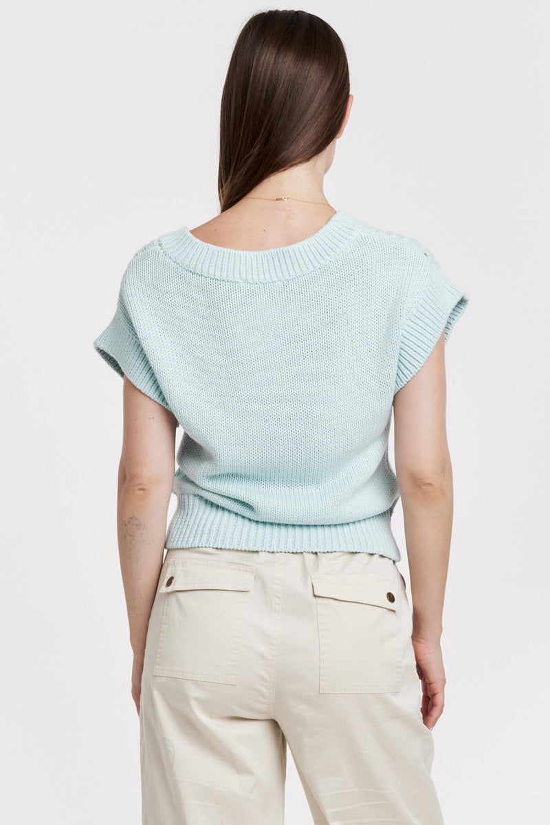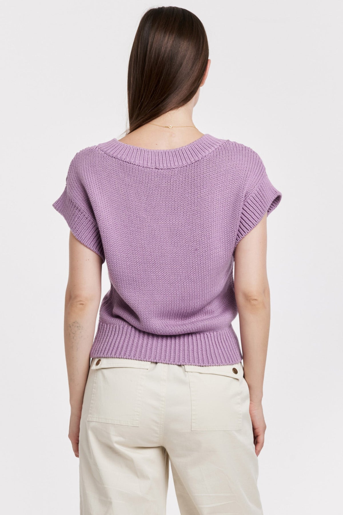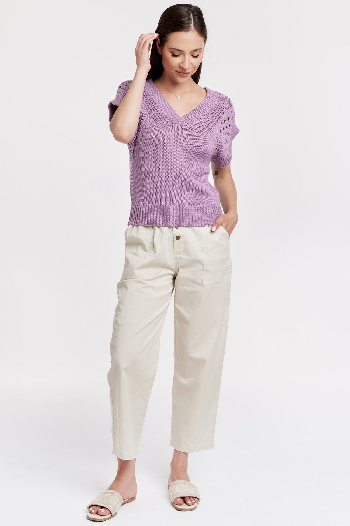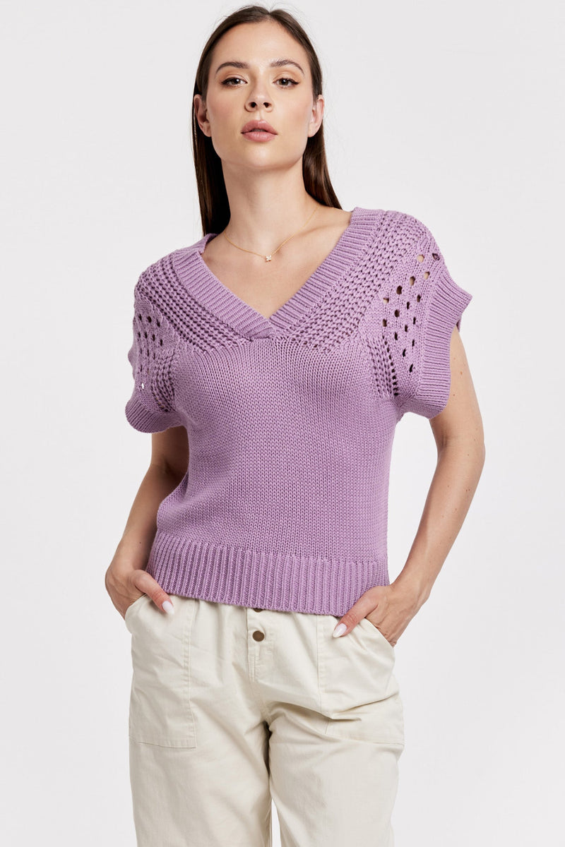 The RENATA crochet detail front , back and sides in pointelle weave, drop shoulder v-neck sweater finished with banded cuffs and waist. Solid color yarn on standard fit. Stunning elegance, classic aesthetics for casual settings.