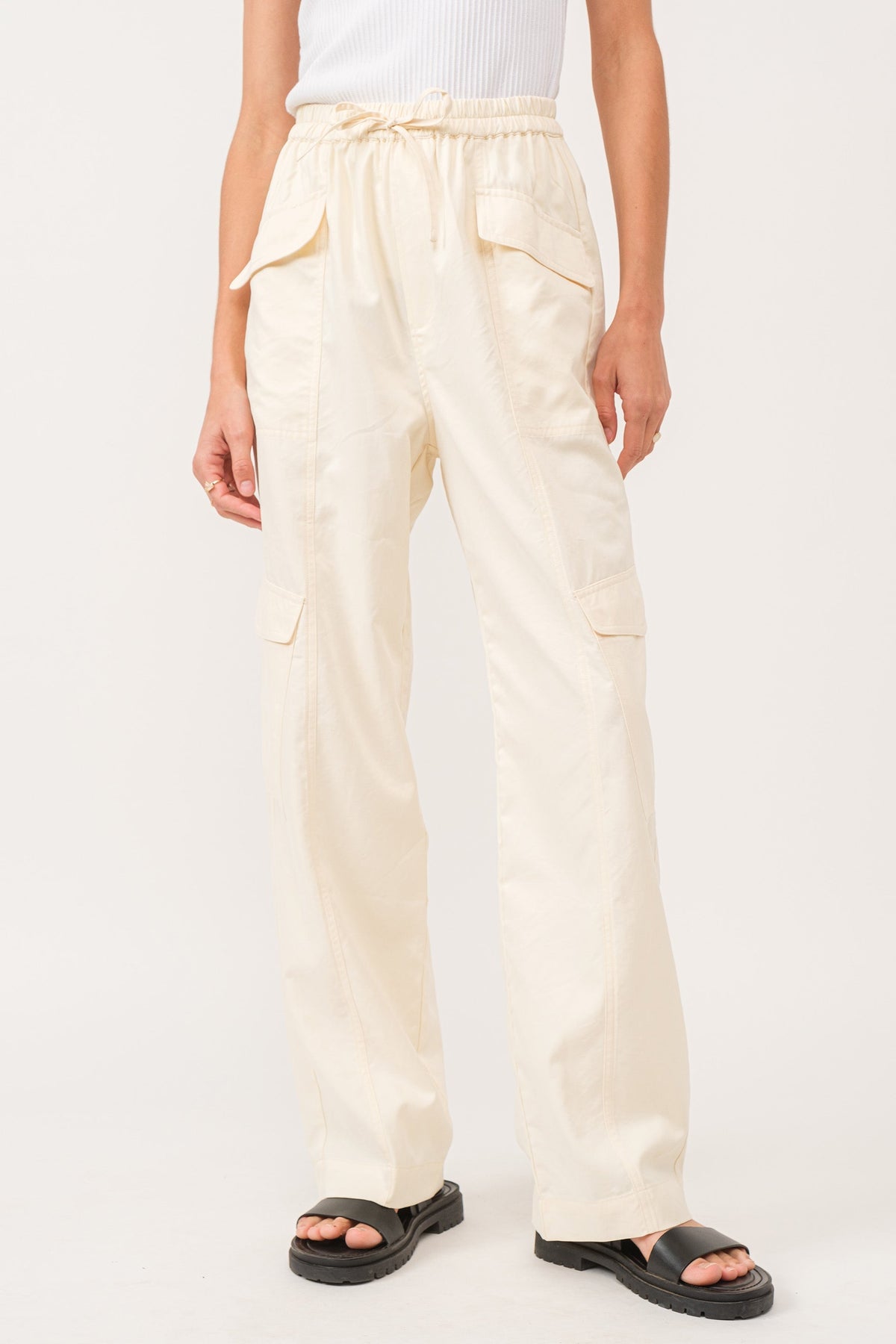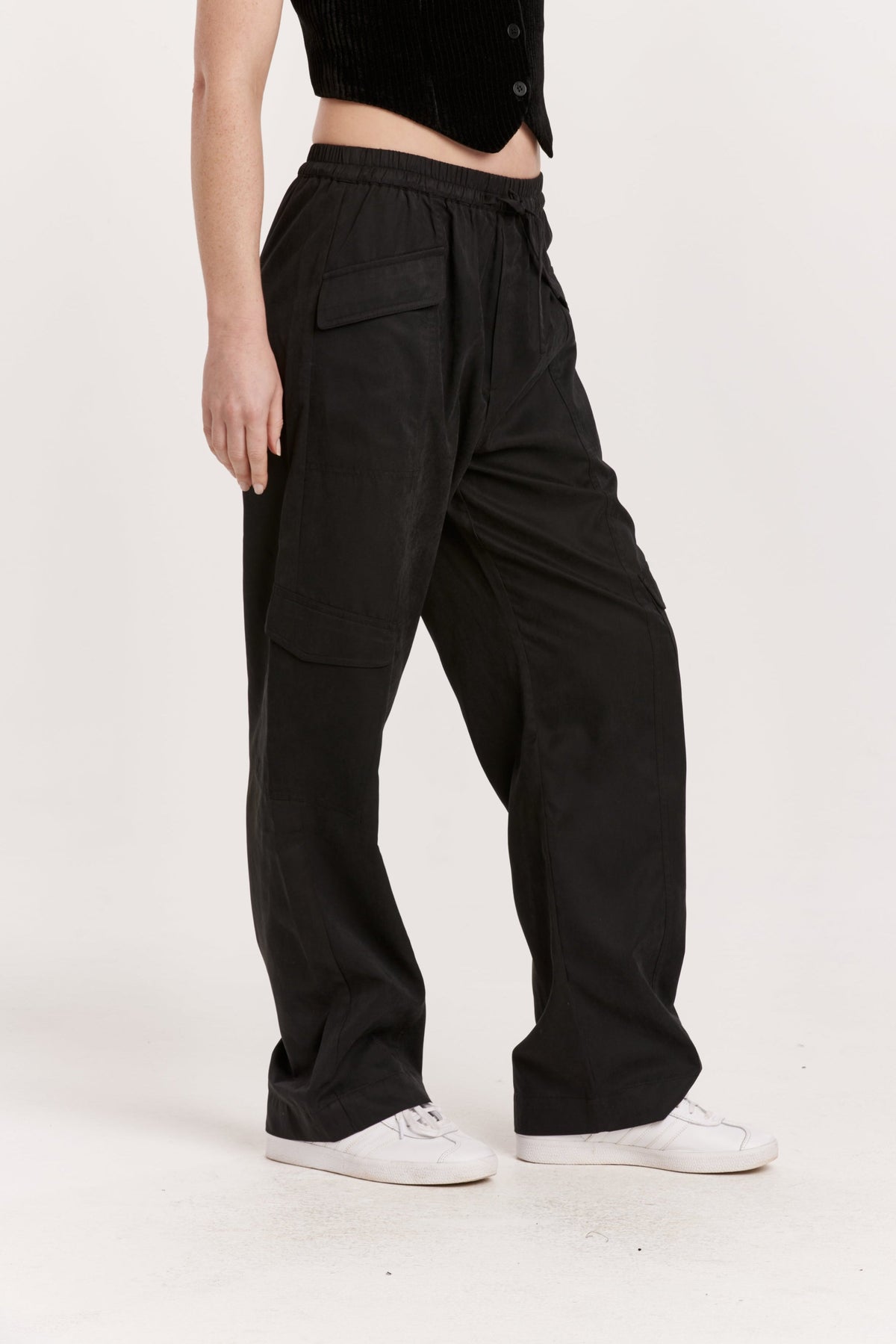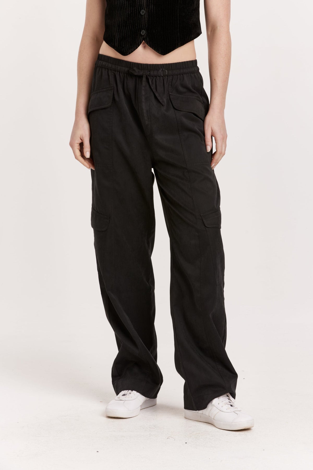 Relish the convenience of an elastic waistband with a drawstring, along with a side pouch pocket and utility flap. Designed to be sleek and functional, these cargo pants are perfect for any lifestyle! The relaxed fit and solid color make for a versatile addition to your wardrobe.