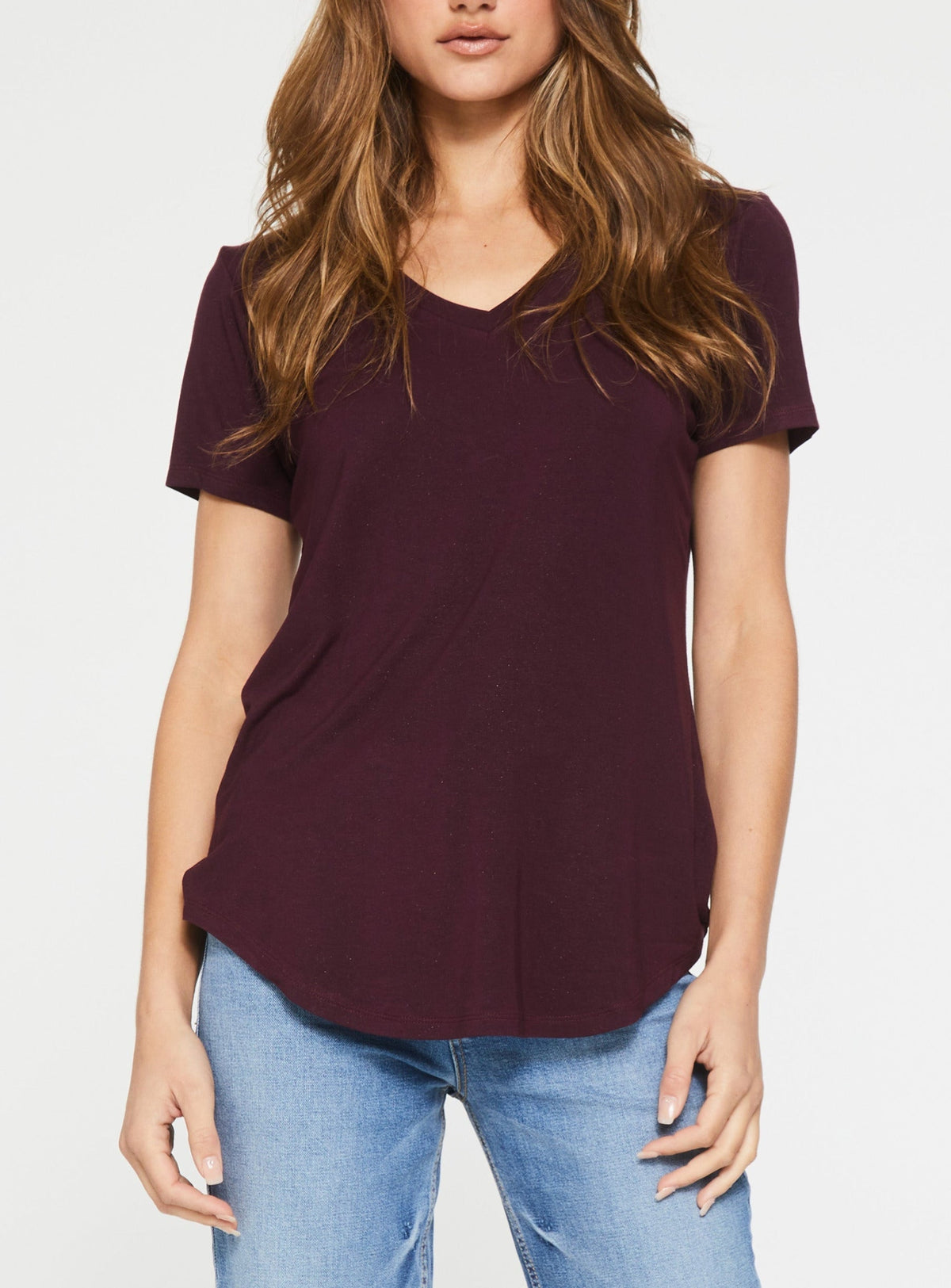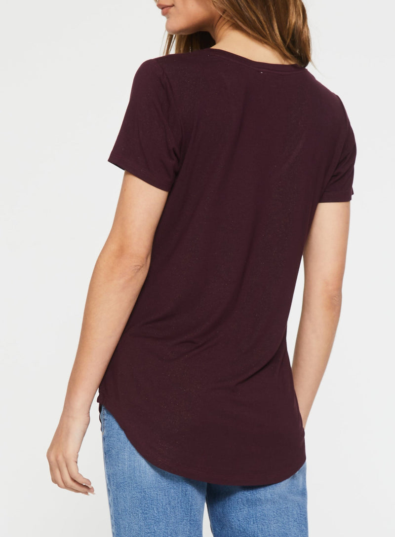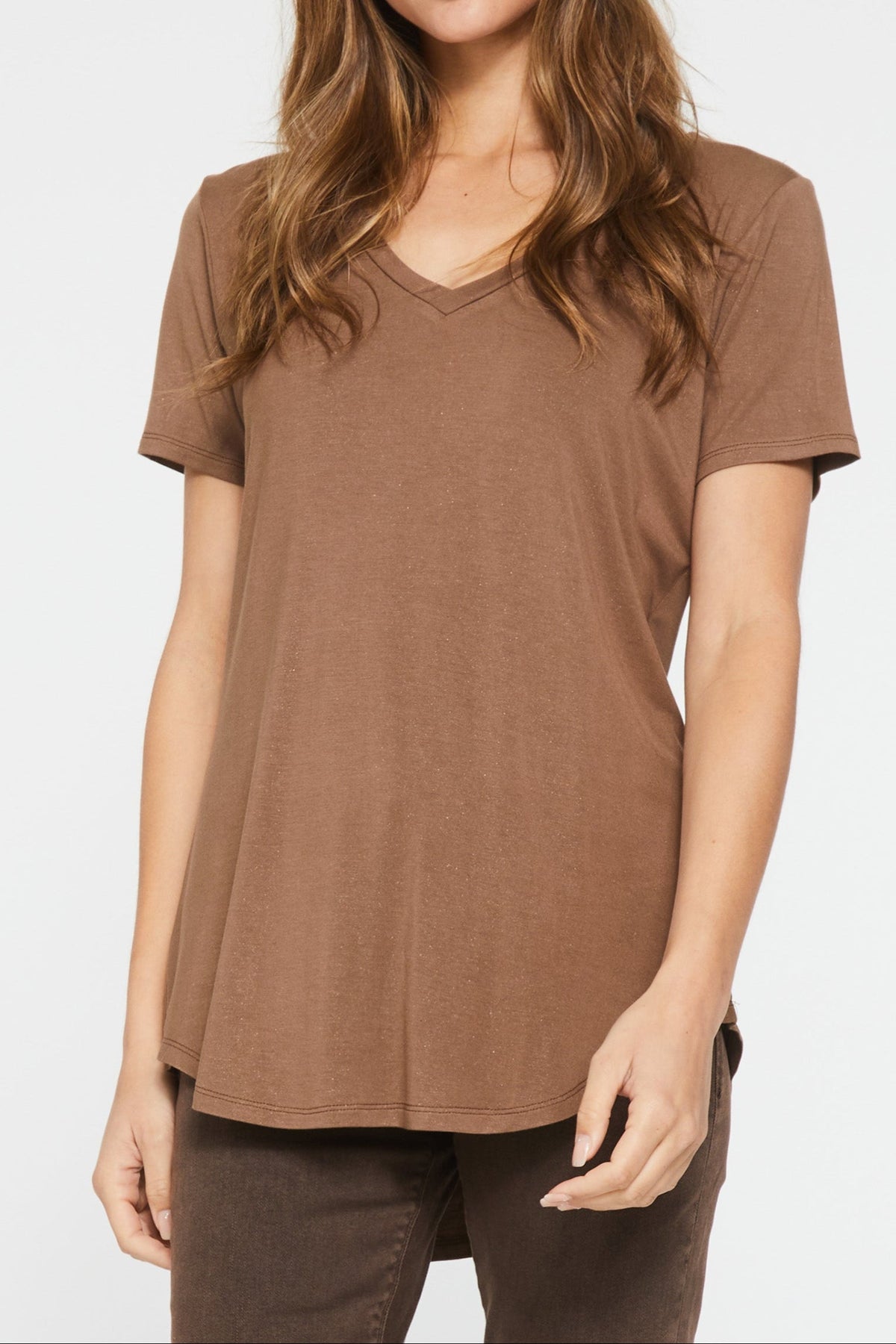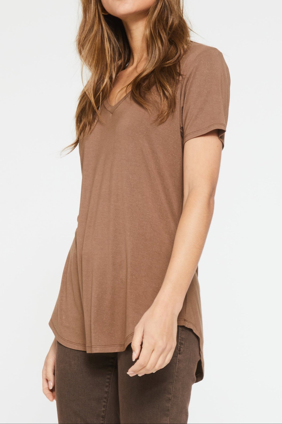 The Valentina gilded top, short sleeve v-neck with curved hem finished in full gold foil coverage. Perfection of Luxe A to Z, casual shopping to hanging out or elegantly shine as the star above! Solid color knit on standard fit.
