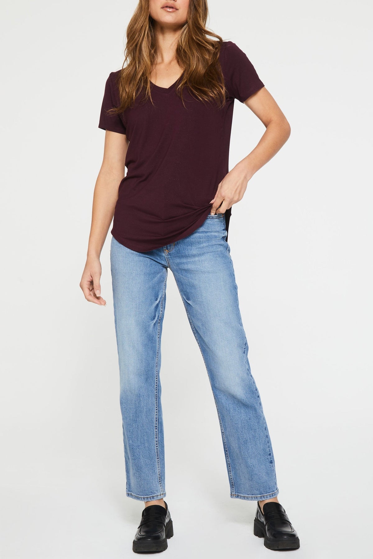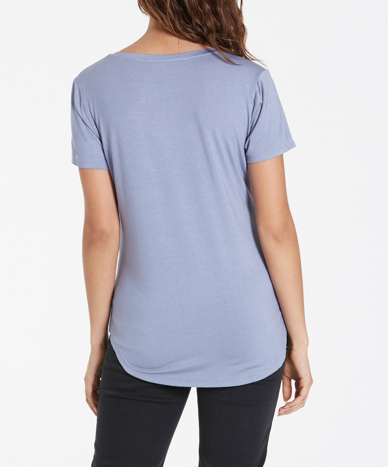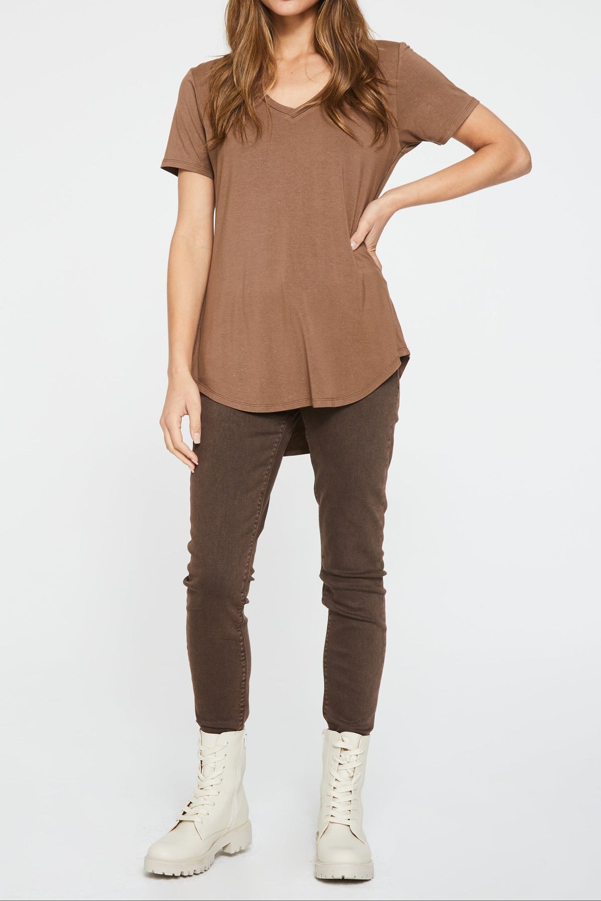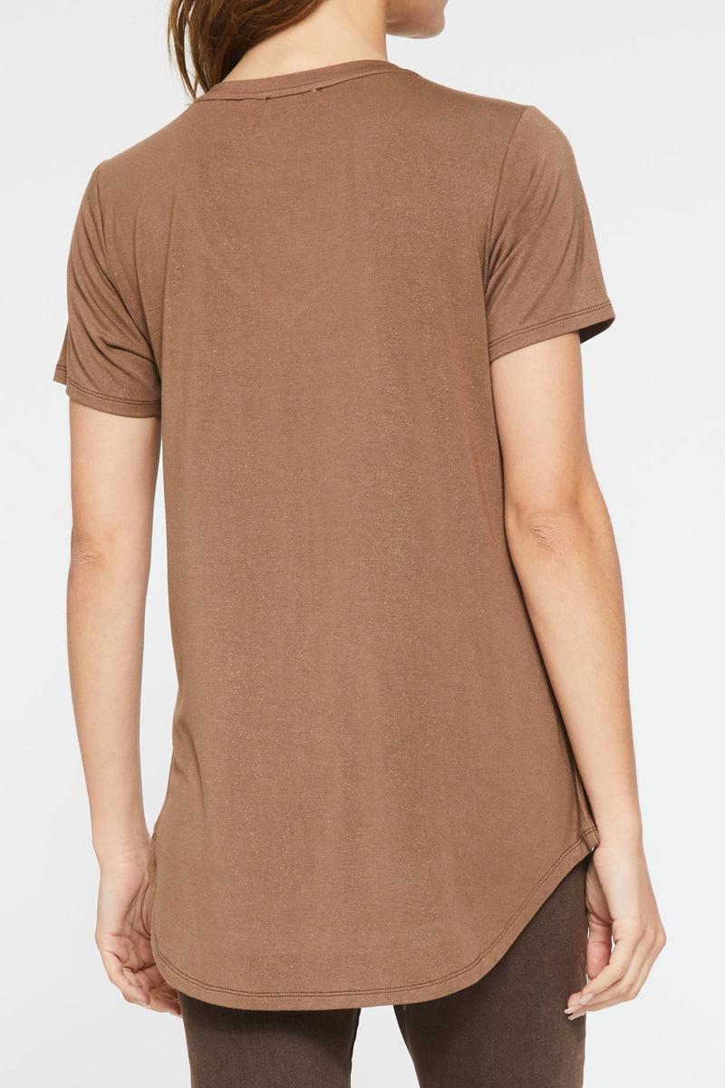 The Valentina gilded top, short sleeve v-neck with curved hem finished in full gold foil coverage. Perfection of Luxe A to Z, casual shopping to hanging out or elegantly shine as the star above! Solid color knit on standard fit.